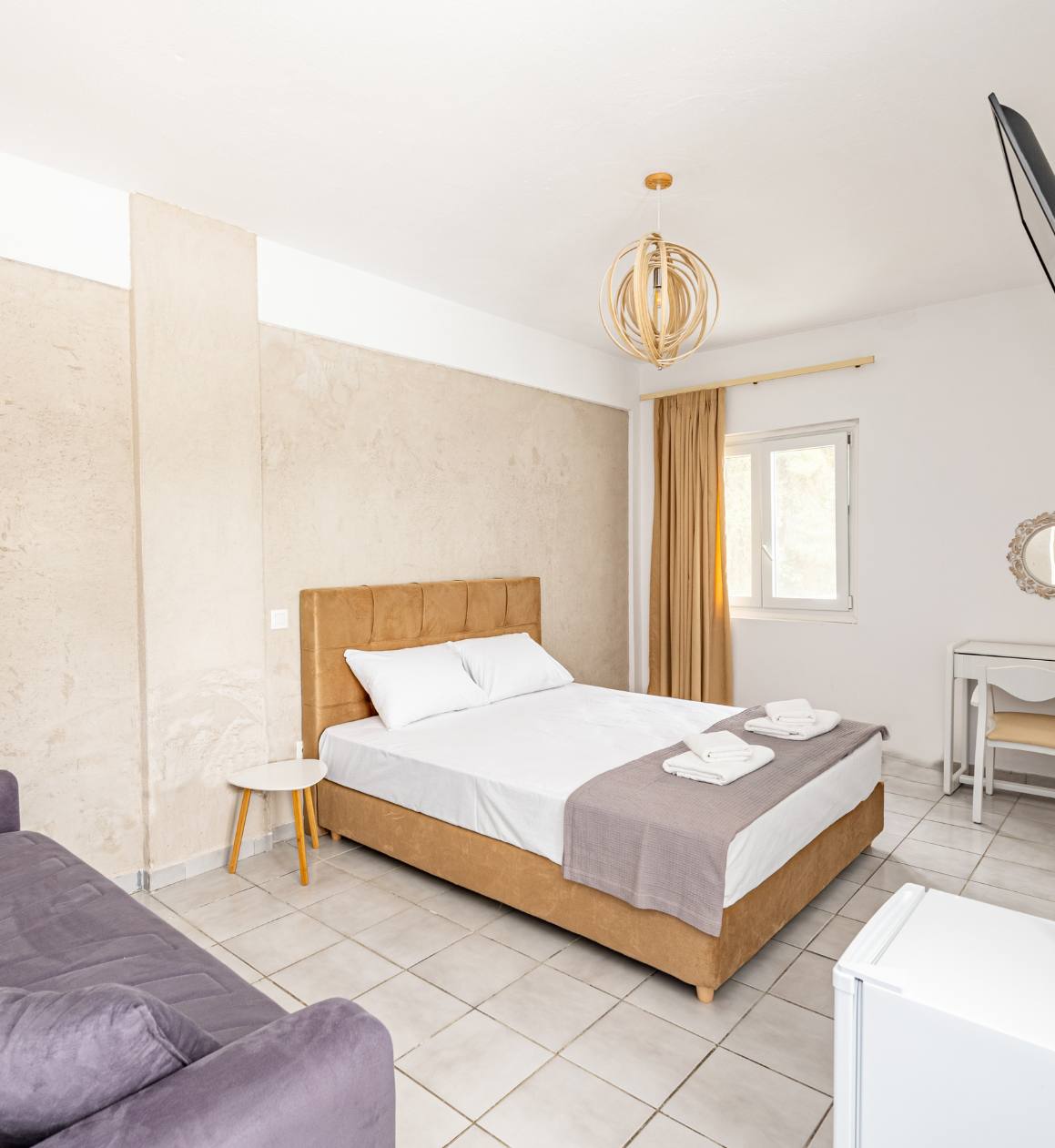 Люкс King с гидромассажной ванной в традиционном гостевом доме Pliades — это роскошный и привлекательный люкс открытой планировки, предназначенный для комфорта и отдыха. В номере есть двуспальная кровать размера King size и дополнительная односпальная кровать, что делает его идеальным для пар, небольших семей или друзей. Наслаждайтесь теплом камина, уединением отдельного входа и стильной ванной комнатой с душевой кабиной, гидромассажной ванной, джакузи и феном.