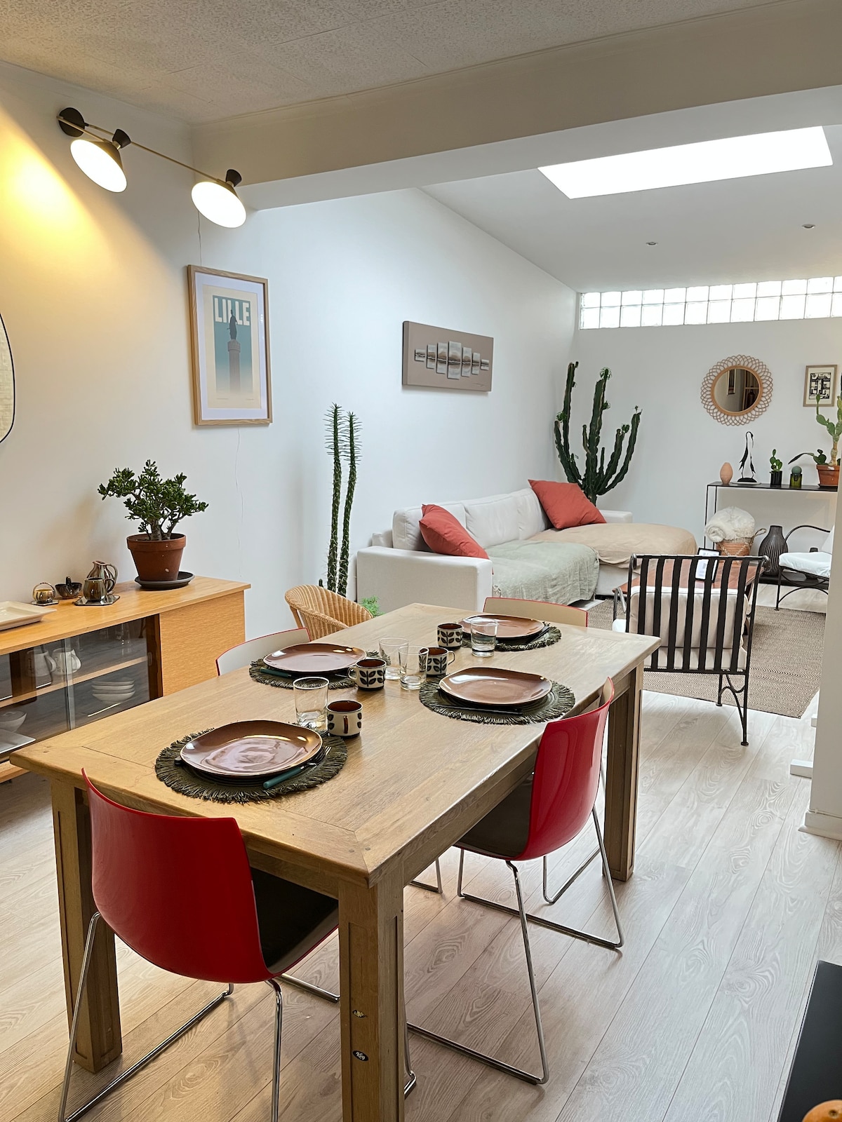 Located in the heart of Roubaix, beautiful 2 levels apartment for 4-5 people in a quiet residence close to public transports (metro, tramway, velibs) and shops. A warm decoration to welcome you, a beautiful fully equipped kitchen, large living / living room with sofa bed, desk, wifi, storage with safe, TV, dining room. One bedroom on a mezzanine with storage and a bathroom with spacious Italian like shower.