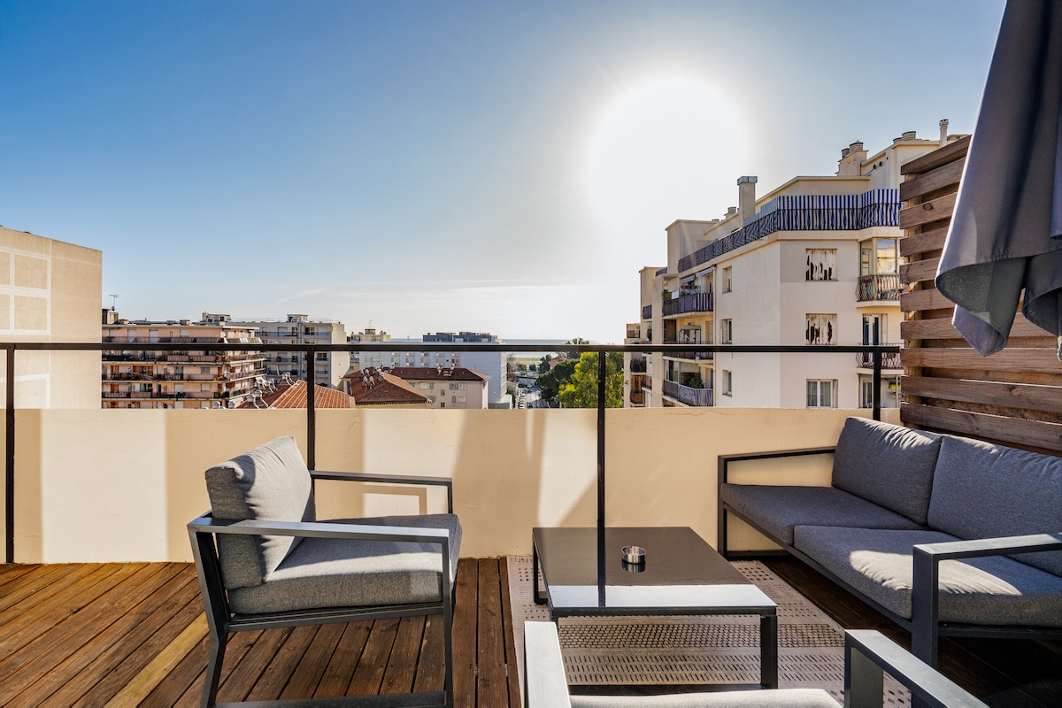 Promenade des Anglais et Front de Mer, пляжная квартира на 6-м и верхнем этаже, этот просторный лофт площадью 50 м2 простирается на открытую террасу с видом на Promenade des Anglais в 10 минутах езды от порта Лимпия, Старой Ниццы и ее площади Массена на общественном транспорте и в 20 минутах езды от аэропорта Ницца Лазурный берег.