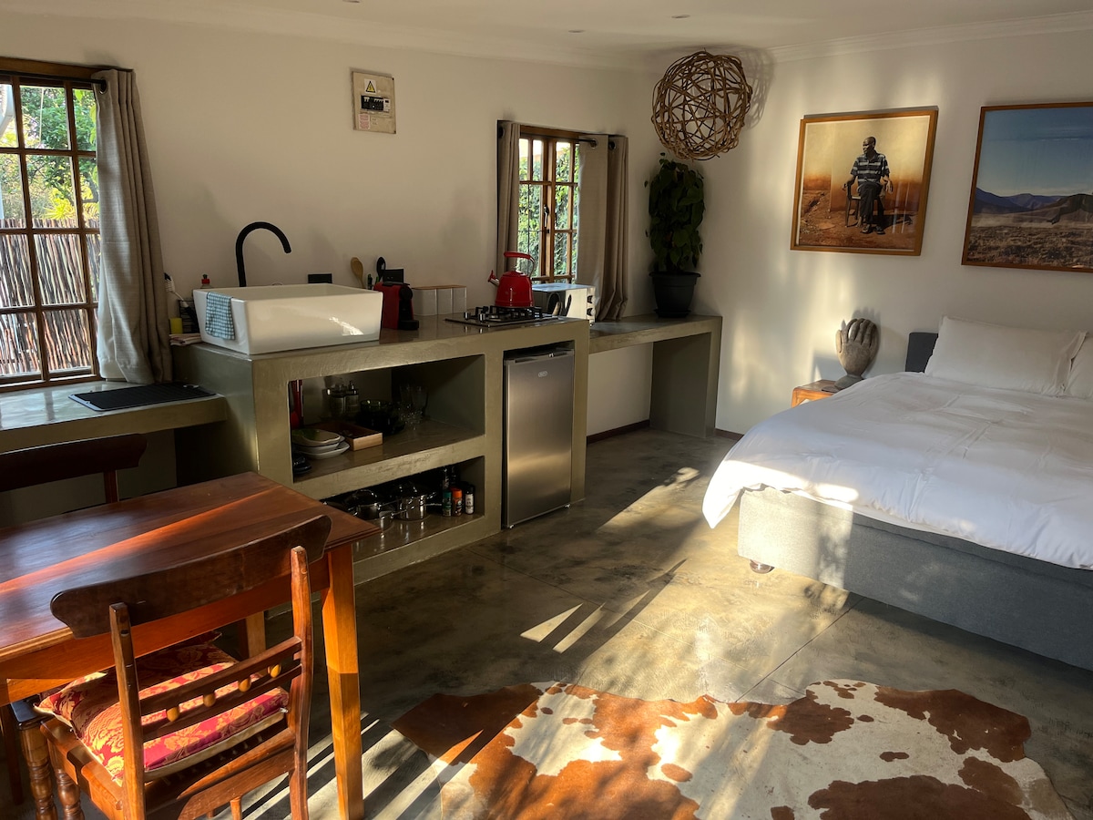 Sunny and spacious private cottage set in quite leafy garden with its own private entrance and Patio. Solar power means that load shedding is no issue. It comfortably accommodates two people in a queen sized bed. Offers a kitchen with granite counters and induction cooking plates as well as microwave and fridge. smart TV (Netflix), Desk / breakfast bar with USB connected plugs. Free Fiber 100Mbs Wifi. Large closet as well as bathroom with high pressure shower and separately enclosed toilet.