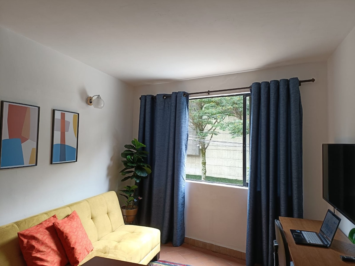 Вид на Кали из лучшего места в парке для собак. Современная квартира для 5 человек с собственным балконом и видом на парк, 3 удобными кроватями, оборудованной кухней (аэрофритюрница, кофеварка, посуда), собственной ванной комнатой, кондиционером, Wi-Fi, Netflix, горячим душем и письменным столом. В 5 минутах от Сан-Антонио, La Topatolondra с уроками сальсы, ресторанами, барами и супермаркетами (OXXO, Carulla). Идеально подходит для семей, друзей или деловых путешественников, которым нужно удобное и центральное расположение.