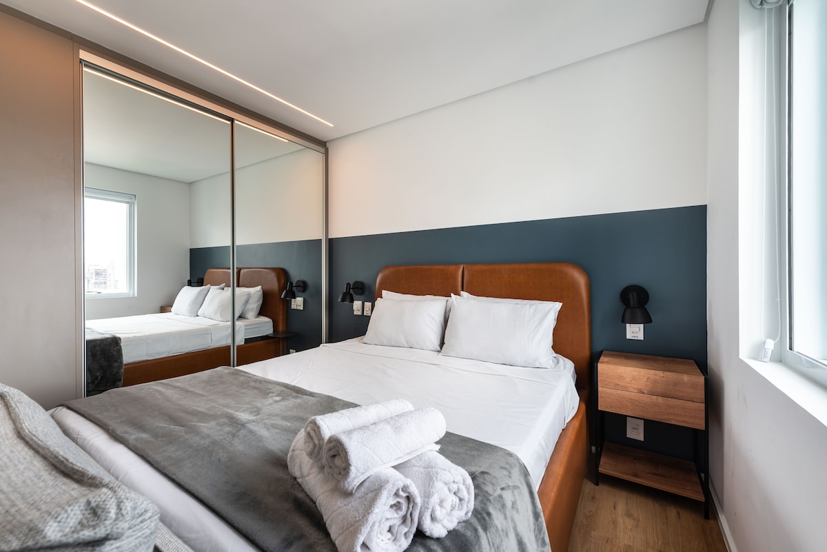Welcome and make yourselves at home. The apartment is brand new, designed especially for you and has impeccable decor, very practical for everyday life. The view is spectacular! The apartment is on the 28th floor. We are in an excellent location in São Paulo, in the Pinheiros neighborhood, with restaurants, supermarkets and bakeries very close by. It's 40m2 (430 sqft) with 1 bedroom and 1 bathroom. Walking distance from Fradique Coutinho subway station (just 2 blocks).