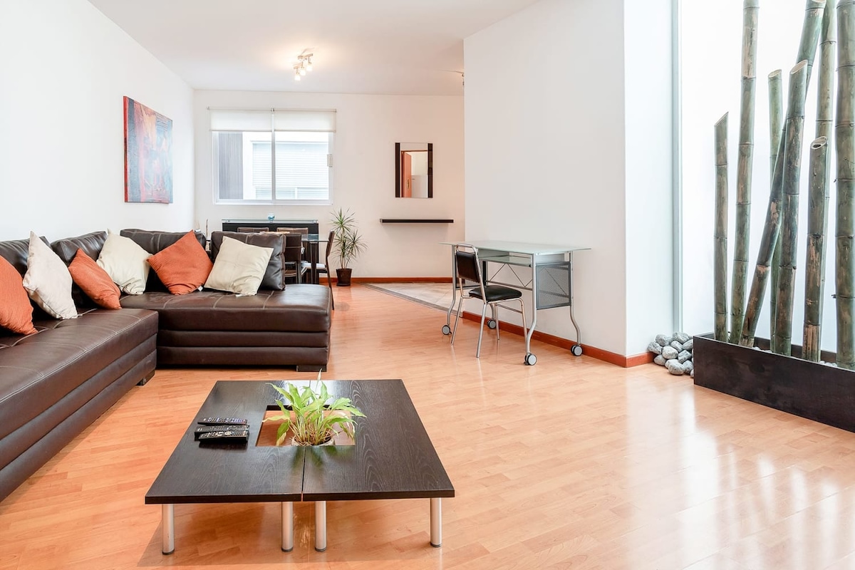 Добро пожаловать В место вашего отдыха с уникальной дизайнерской квартирой в Мехико. Оживленные растения, деревянный пол и декор, контрастные текстуры и мотивы, настенная стена художника на главной террасе и открытые жилые пространства. После долгого дня в Мексике можно отдохнуть на открытой террасе. Жилье заполнено деталями и удобствами для вас. Мы контролируем каждое жилье после уборки, это очень важный шаг для наших гостей.