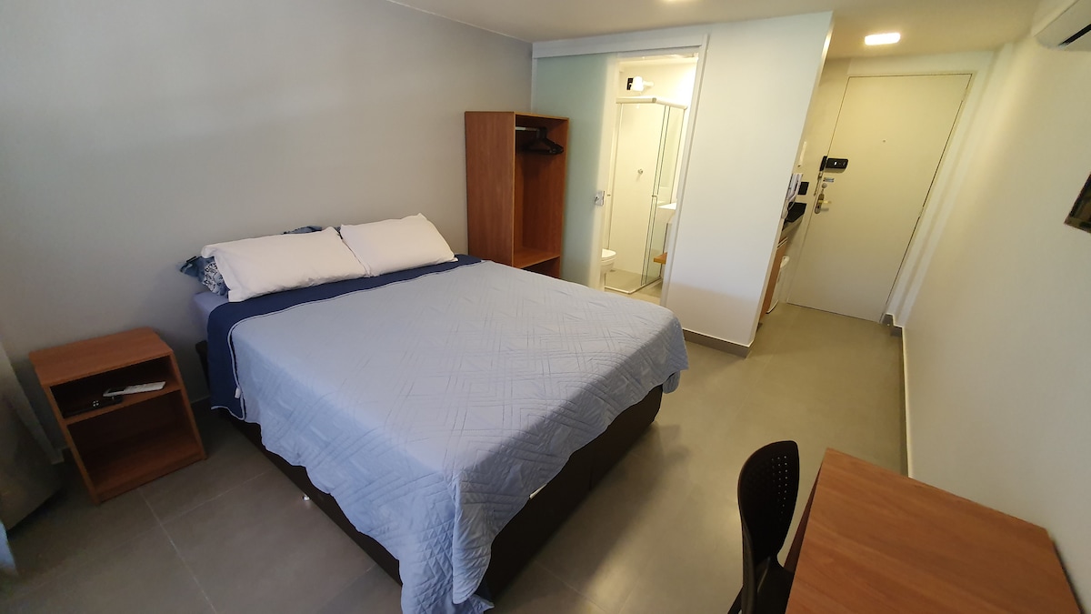 Студия расположена по адресу CLN 213, на Asa Norte, с Wi-Fi Fibra(300 Мбит/с) , холодильником , двуспальной кроватью размера Queen size, кондиционером, микроволновой печью, феном, стиральной и сушильной машиной, эспрессо-машиной, эспрессо (Nespresso), плитой с 2 ртами с багажником. Жилье расположено в регионе, где есть рынок, тренажерный зал, кафе, мороженое, пиццерия, пекарни, пекарни и всевозможные рестораны. Рядом с парком Olhos Dágua, одним из лучших кортов Северной Асы.