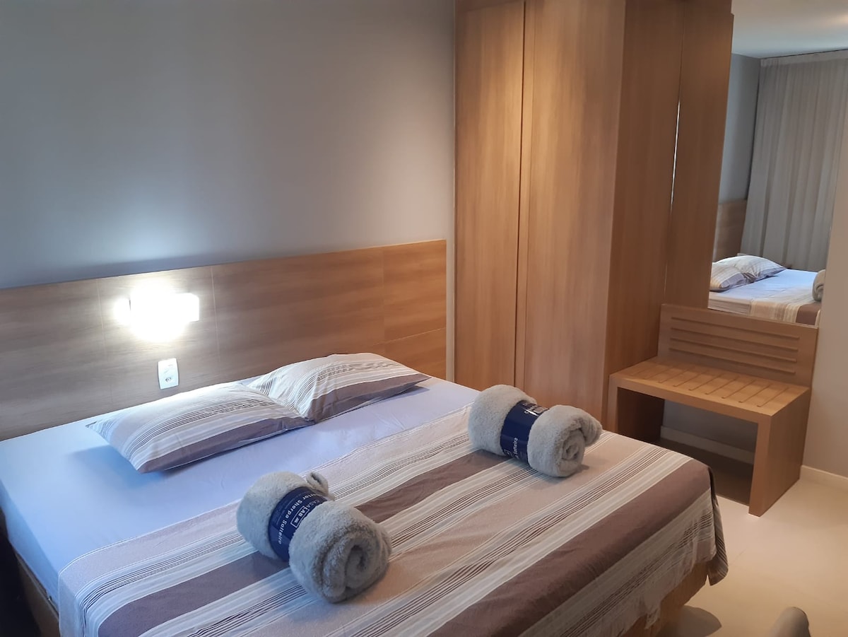 Квартира светлая, просторная и тщательно подготовлена, чтобы обеспечить комфорт. В номере есть две односпальные кровати, которые можно соединить, чтобы сформировать двуспальную кровать, а также кабельное телевидение, кондиционер, шкафы и кухня, оборудованная мини-баром, микроволновой печью, кофеваркой, фильтром для воды, индукционной плитой и сэндвичницей. Идеально подходит для тех, кто путешествует для отдыха или работы. В кондоминиуме отличная инфраструктура, бассейн, сауна, фитнес-центр и ресторан.