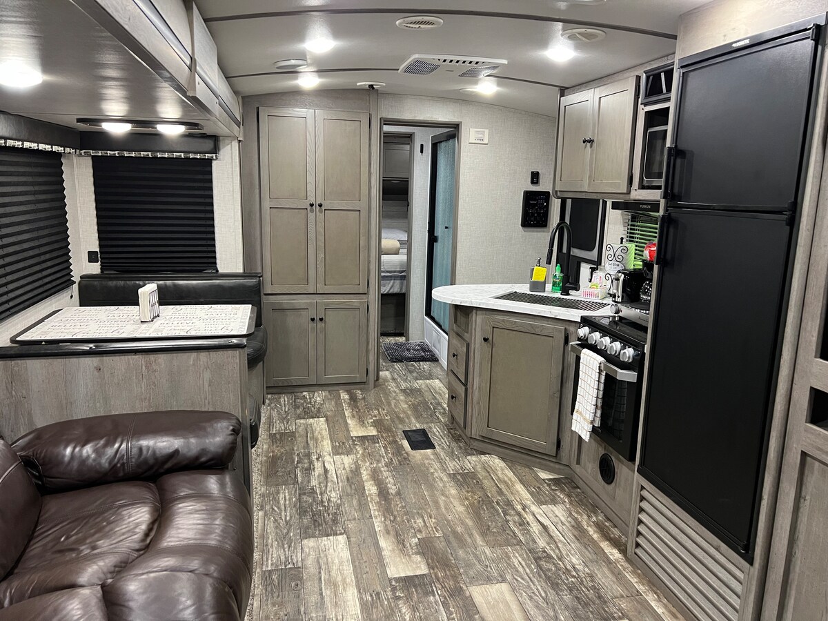 Новый трейлер с небольшим количеством использования, расположенный рядом с популярным центром Нью-Порт-Ричи! К трейлеру прикреплен открытый гриль с полностью оборудованной кухней и ванной комнатой. Телевизор внутри с доступом к Netflix. В главной спальне установлена кровать размера Queen size. Диван превращается в полноразмерную кровать, а также имеет 2 полноразмерные двухъярусные кровати. Раннее прибытие стоит 20 $, а поздний выезд также за 20 $ по запросу, и он доступен.