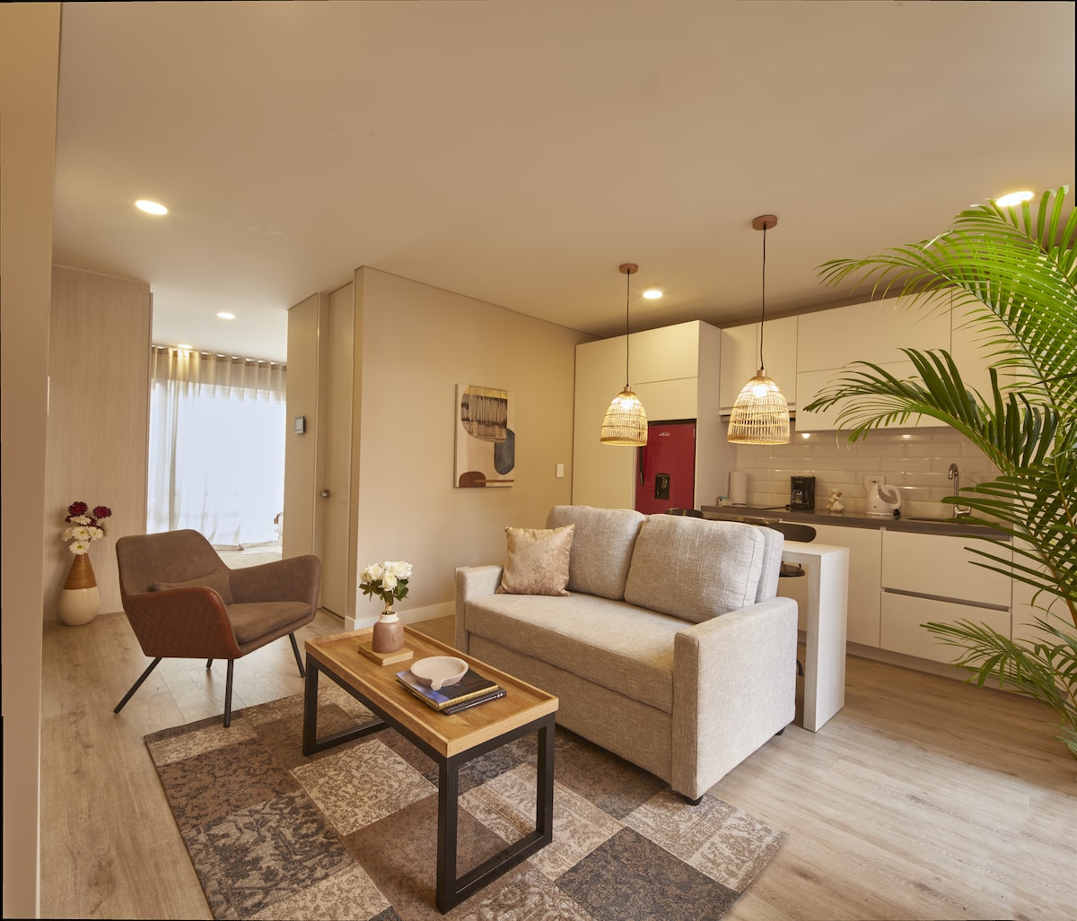 Эта современная квартира предлагает комфорт и спокойствие. Квартира с одной спальней и одной ванной комнатой полностью оборудована, чтобы обеспечить приятное пребывание. Всего в 5 минутах от станции TransMilenio и в 10 минутах от торгового центра. Жилье идеально подходит для путешественников, семей или пар. Наслаждайтесь высокоскоростным Wi-Fi, кухней и зданием с круглосуточной охраной. Уютный и стильный дизайн идеально подходит для отдыха или работы. Приезжайте и наслаждайтесь уникальным Впечатлением в городе!
