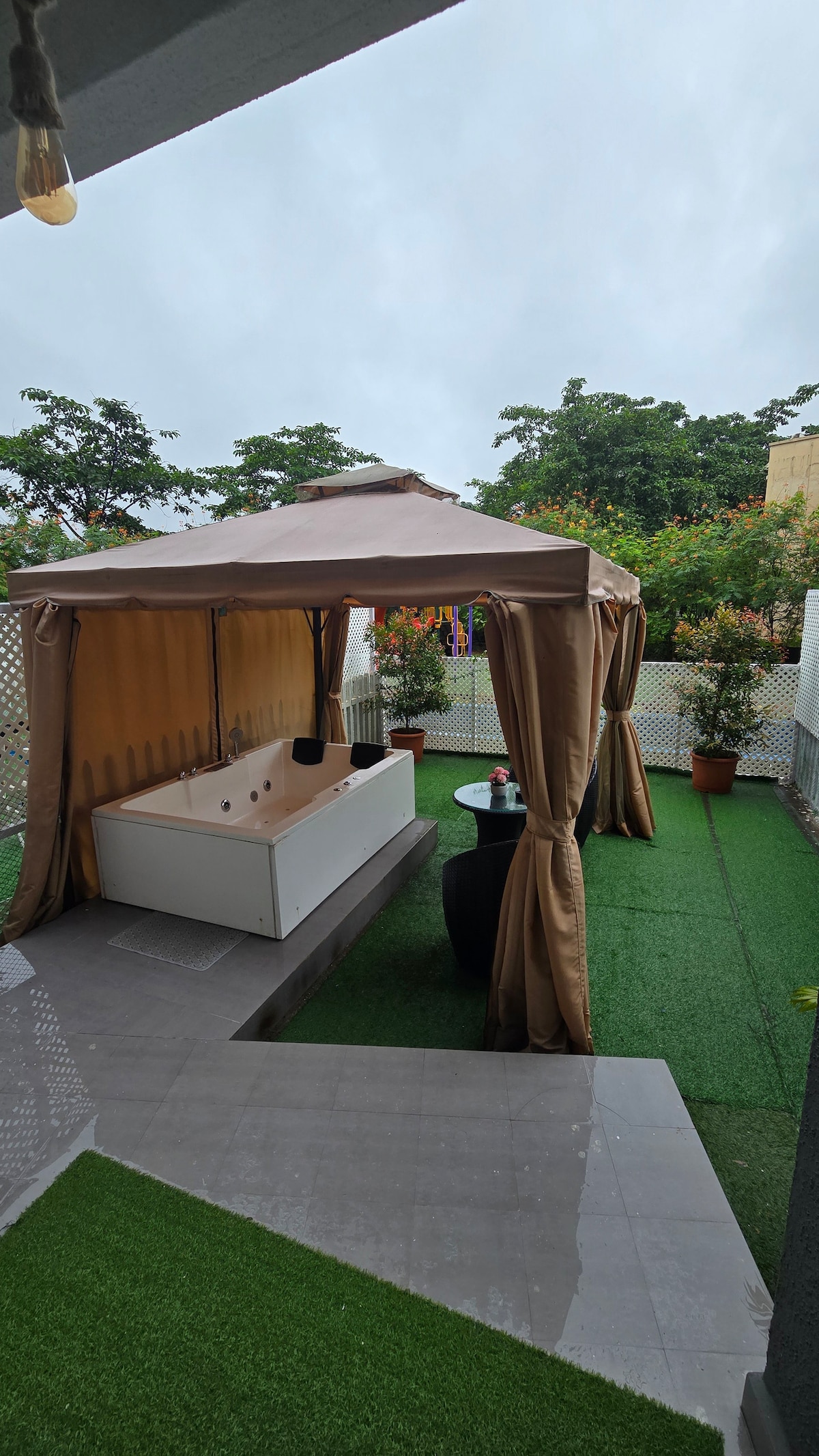 Роскошная студия в стиле бохо с джакузи и садом. Спокойный отдых. Полностью загруженный Wi-Fi, домашний кинотеатр JBL 2.1, музыкальная система BT, LED-телевизор с Full-HD. Стильная ванная комната с туалетными принадлежностями. Кладовая с принадлежностями для чая/кофе, водоочиститель, микроволновая печь, индукционная плита, холодильник и тостер. Огороженный сад для детей. Поужинайте в саду с прекрасной погодой. В джакузи есть горячая вода, которой можно пользоваться в любое время. Общие удобства на территории, такие как бассейн, игровая комната, тренажерный зал, мини-театр, велоспорт и ресторан.