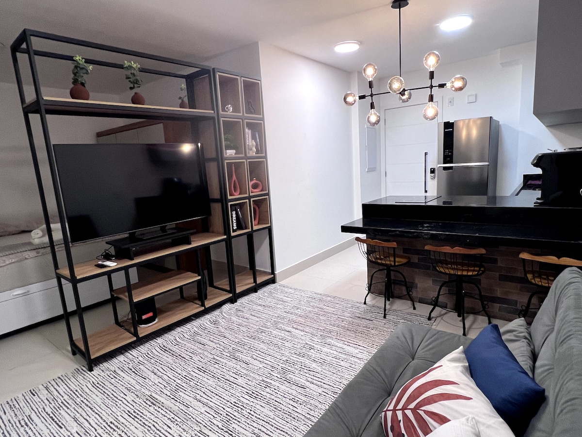 Вас ждет Кемпинас Сетин в Мидтауне. Наша квартира в стиле студии площадью 45 кв. м с полностью открытой концепцией, в комплекте с посудой, кондиционером, всеми удобствами, которые вы хотели бы иметь в своем жилье в сочетании с современным декором. К услугам гостей частный гараж, круглосуточный консьерж и «рынок». Мы находимся в 10 минутах от аэропорта Виркопос, в 5 минутах от Royal Palm Eventos.