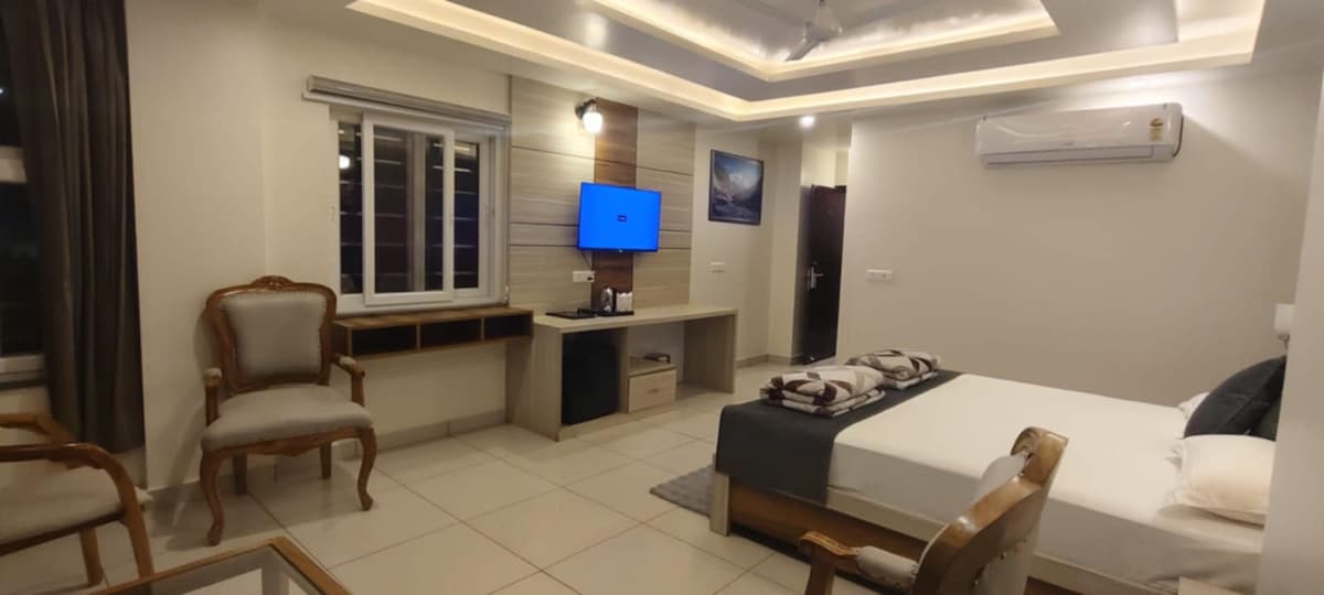 Добро пожаловать в Sapphire Suites, Массури, ваш идеальный горный отдых! Номер Mountain View Room 1 предлагает комфорт, роскошь и потрясающие виды на Гималаи. Он предназначен для гостей, которые любят спокойствие, уединение и первоклассное гостеприимство. ✨ Что вам понравится: Просторная и элегантная спальня с уютным освещением. Отдельный балкон с завораживающим видом на горы и долину. Кровать размера Queen size с постельным бельем премиум Современная ванная комната с горячей водой 24x7 Бесплатный Wi-Fi и телевизор со Smart LED.