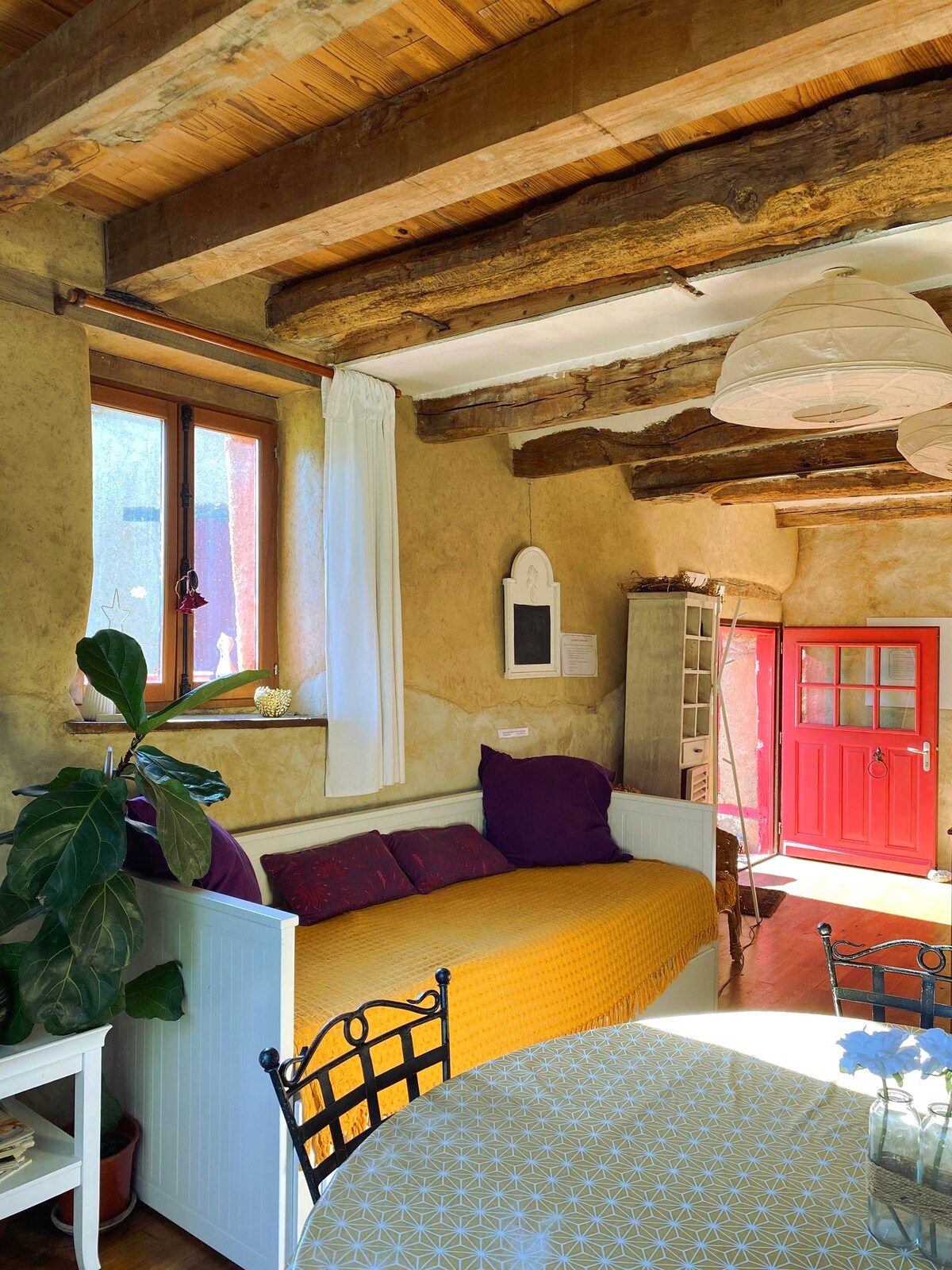 Douceur de vivre dans une maison en terre ! Au sein des « Gîtes Les Fleuries », cette jolie mini-maison en bauge (terre crue), nommée L’Atelier, a été rénovée en matériaux naturels, terre, bois, chaux…, ce qui apporte une qualité de bien-être, une sensation de cocon. Ce lieu écologique (ancien corps de ferme) est en cours de réhabilitation en gîtes, esprit nature, dans le respect du bâti ancien.