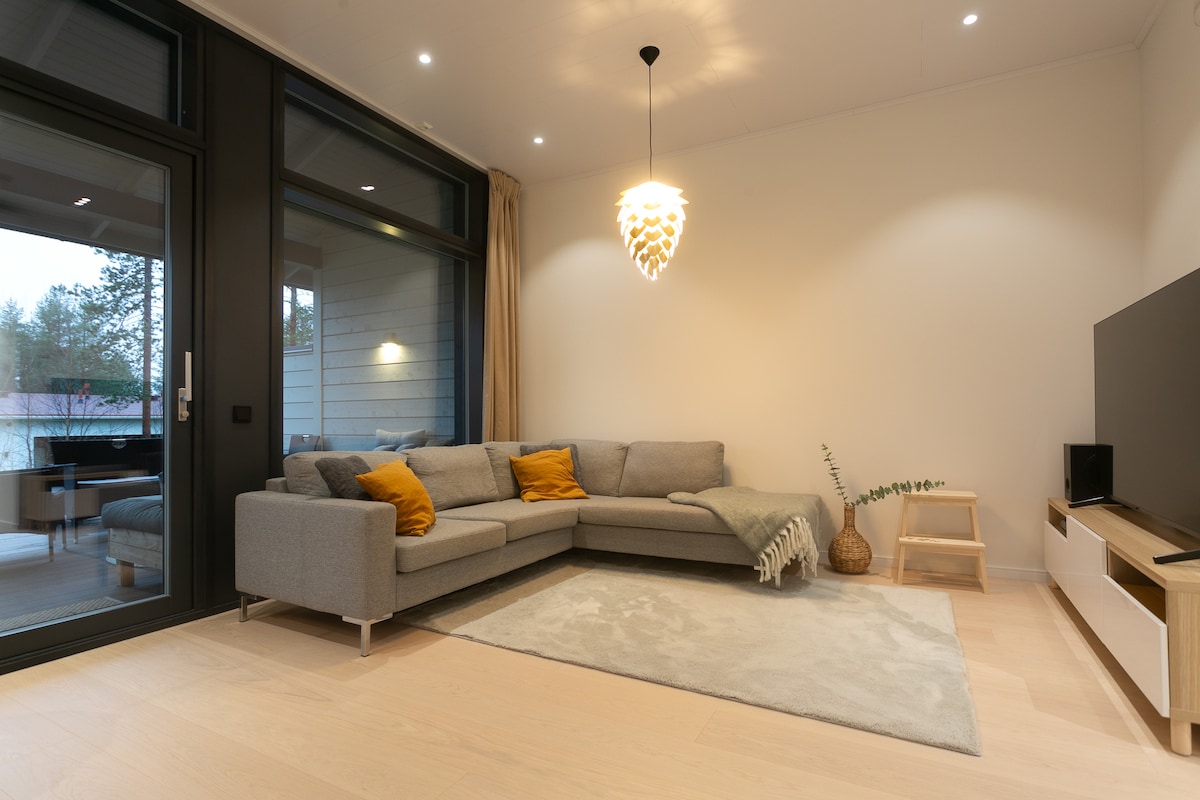 Стильный и непринужденный отдых в новом, красивом доме в Пюхятунтури! Зимой вы также получите доступ к 2 лыжным абонементам (стоимость: 500 евро/1 неделя). Отличное место в самом центре города. Прогулка до склона, лыжи, услуги, велосипедные и пешеходные маршруты. Наш отпуск прост и прост. Уборка и постельное белье всегда включены. На балконе квартиры можно воспользоваться джакузи с подогревом. Забронируйте отдых в Пюхее!