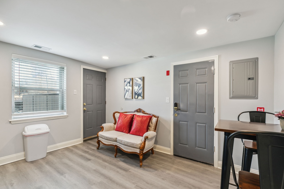 Красивый район художественного музея Студия - Эта просторная квартира открытой планировки с высокими потолками с деревянными полами, полноразмерной кроватью Murphy, футоном; 60-дюймовым телевизором с поворотным креплением, Wi-Fi, собственной ванной, стиральной/сушильной машиной, духовкой и микроволновой печью. Всего в нескольких кварталах от многих отличных достопримечательностей, включая музеи, рестораны, парки и многое другое! Бесконтактное прибытие и уединение вашего собственного уникального жилья в этом двухквартирном доме. В пешей доступности от метро Met, Broad Street и местных закусочных.