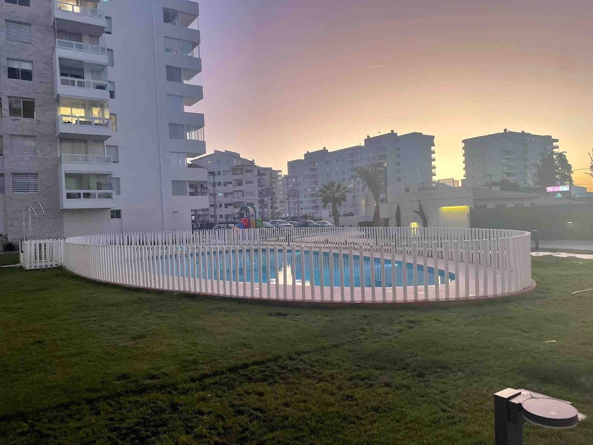 Расслабьтесь в этой красивой полностью оборудованной квартире. * быстрый Wi-Fi; * отопление; * Фен. * Утюг. * Постельное белье * электрический тостер; * Материалы для чтения. *Настольные игры. * Колготки безопасности по всему жилью. Наслаждайтесь солнечным бассейном с зелеными зонами, игровой зоной, quinchos, многофункциональной комнатой, парковкой, круглосуточным контролируемым доступом и пешеходным доступом к лучшим пляжам города.