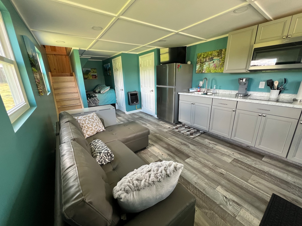 Расслабьтесь в этом уникальном и спокойном месте. Идеально подходит для одного или двух взрослых. Удобная двуспальная кровать размера King size, отдельная ванная комната, мини-кухня (не кухня) с фритюрницей/тостером, микроволновой печью и keurig. Отдохните от суеты и суеты и остановитесь ближе к природе в этом прекрасном частном люксе. Предоставляются постельное белье, полотенца и многочисленные кухонные принадлежности. Много популярных развлечений и пейзажей в близлежащих городах и деревнях. Бесплатный Wi-Fi доступен, но может быть ненадежным.