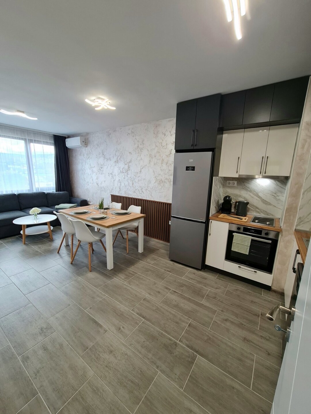 Enjoy a comfortable stay in this charming 1-bedroom apartment, featuring a cozy living room and a fully equipped kitchen — perfect for short or long stays. Located in a quiet residential complex with a kids' playground and walking paths, it's ideal for families or couples. Just a short walk to Grand Mall Varna and the main bus station, this is a convenient and relaxing base to explore the city!