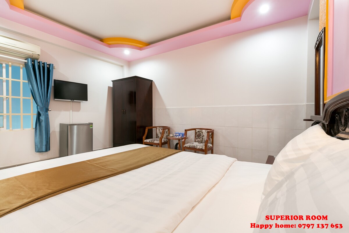 Комната полностью меблирована, очень удобна и оснащена двуспальной кроватью размера Queen size. Окно выходит в коридор и очень защищено от ночных городских звуков. Знаменитая улица Буй-Вьен находится буквально за углом, со множеством ресторанов, кафе, баров и клубов. Это одна из самых популярных туристических достопримечательностей Сайгона, и здесь всегда очень людно, особенно ночью. АКОРН находится на улице Буй-Вьен, но спрятан в переулке в начале улицы. Так что это идеальное место для проживания:)