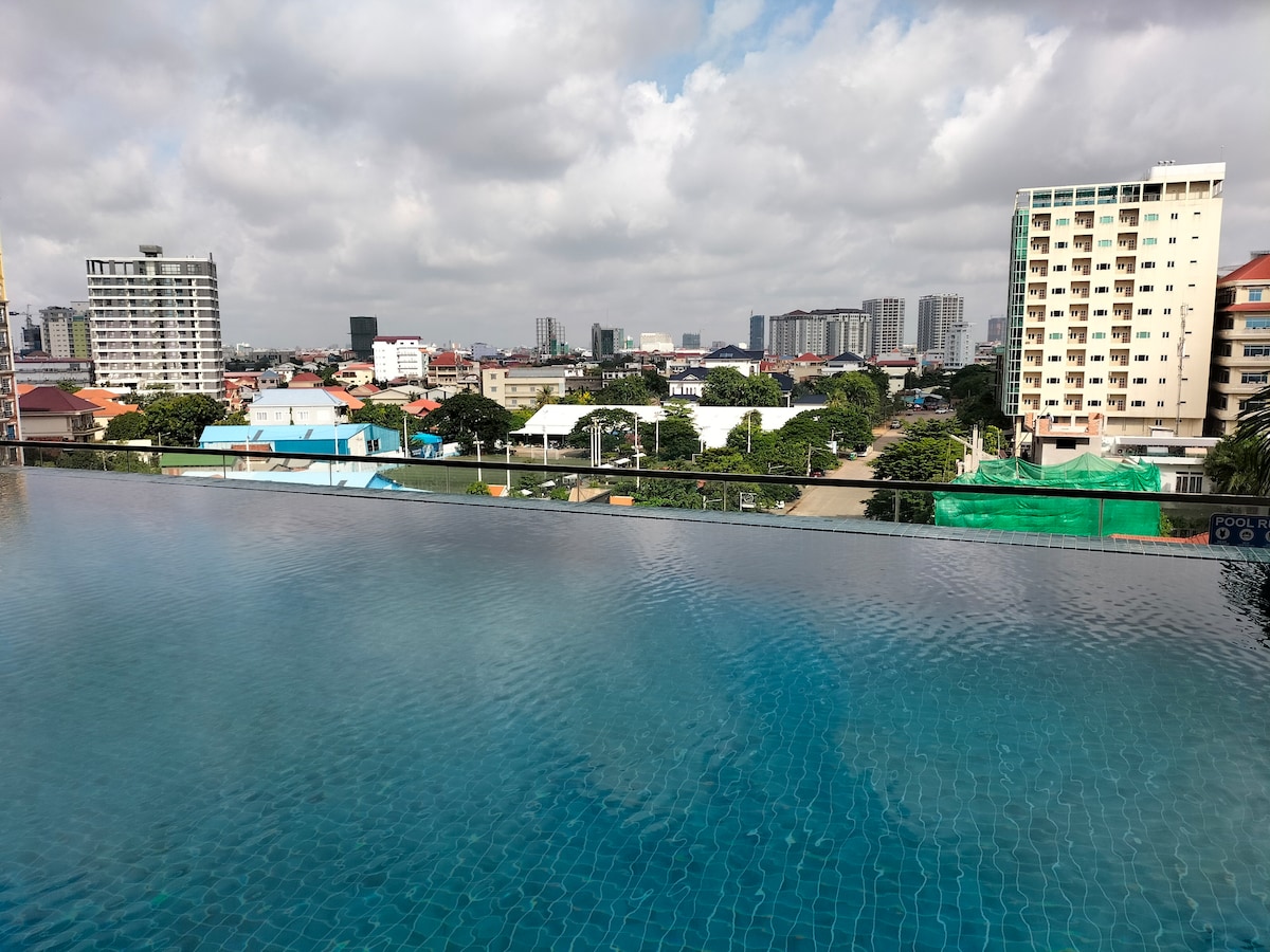 Наша элегантная представительская резиденция с 2 спальнями и 1,5 ванными комнатами полностью меблирована по гостиничным стандартам и расположена на высоком этаже с потрясающим панорамным видом на город. В нескольких минутах от NagaWorld и Koh Pich, идеально подходит для деловых путешественников, пар, семей или длительного пребывания. Включает просторную гостиную, современную кухню, высокоскоростной Wi-Fi, стиральную машину, отдельную ванную комнату + гостевой туалет. К услугам гостей утюг, фен, чайник, холодильник, полотенца и туалетные принадлежности для комфортного проживания класса люкс в Пномпене.