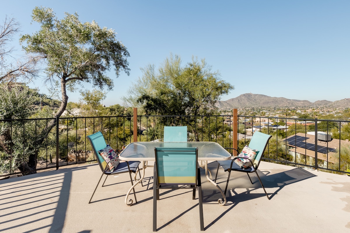 Stay here and immerse yourself in the natural romantic beauty of Arizona. Enjoy not only stunning mountain views but also the cityscape of downtown Phoenix. With walls of windows bringing the outside in, a spacious living area, king beds, and idyllic private patios, let the beauty of nature be the backdrop for sweet memories in our hillside mid century view home. Only 15 minutes from the airport, our guests love the convenient central city location.