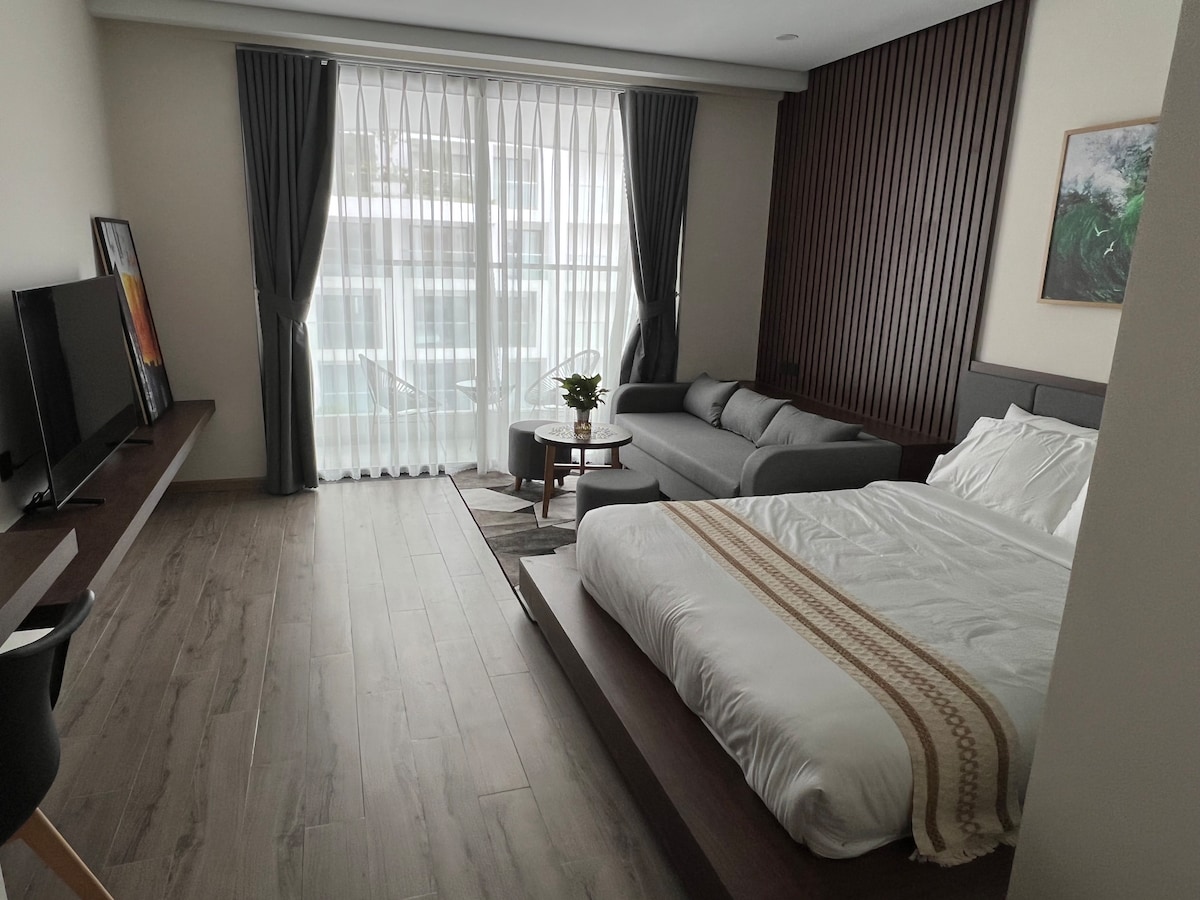 Studio 22m² với giường king, nhà vệ sinh sạch sẽ trong phòng và ban công hướng biển và thành phố thoáng mát. Khách có thể sử dụng hồ bơi vô cực, gym, spa, nhà hàng (có phụ phí).
