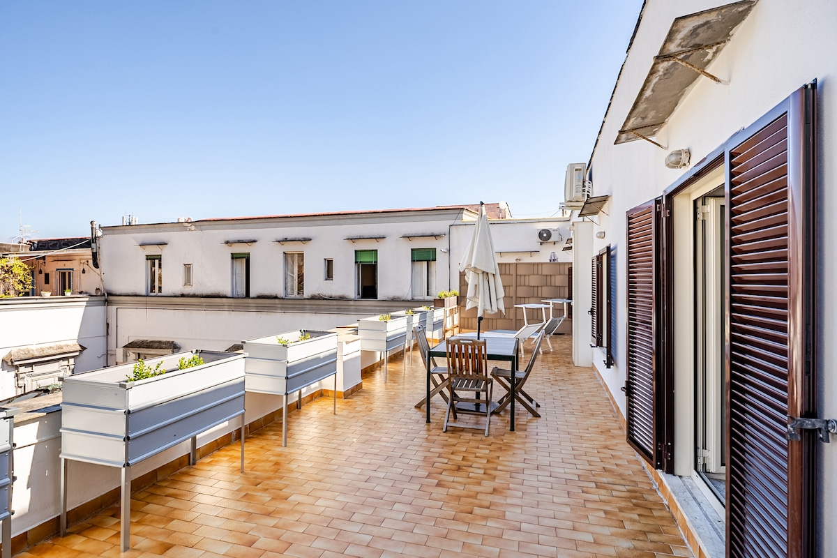 Роскошная квартира: сочетание классической элегантности и современности, недавно отремонтированная, с ДЖАКУЗИ и СОБСТВЕННОЙ КРЫШЕЙ площадью 90 кв. м, откуда можно любоваться вулканом Везувием. Жилье расположено в историческом здании на 3-м этаже без лифта в центре старого города, до всего можно дойти пешком. Wi-Fi, PrimeVideo, Nespresso и БЕСПЛАТНОЕ хранение багажа Интересные места • 2 минуты до Дуомо. • 4 минуты до Подземного Неаполя • 6 минут на метро L1 и L2. • 5 минут до железнодорожного вокзала. • 10 минут до гавани;