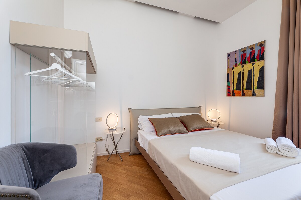 Люкс Family Design - это эксклюзивная квартира в центре Рима в сочетании с роскошью, комфортом, функциональностью и эстетикой, задуманная талантливой работой миланского дизайнера Джакомо Мура, названной в 2016 году лучшим молодым дизайнером Elle Decor Italia. Стена каштана, которая скрывает удобную мини-кухню, большой шкаф и входную дверь в ванную комнату, которая окружает гостей грубой травертиновой раковиной, - вот лишь некоторые из утончений, адаптированных к вам.
