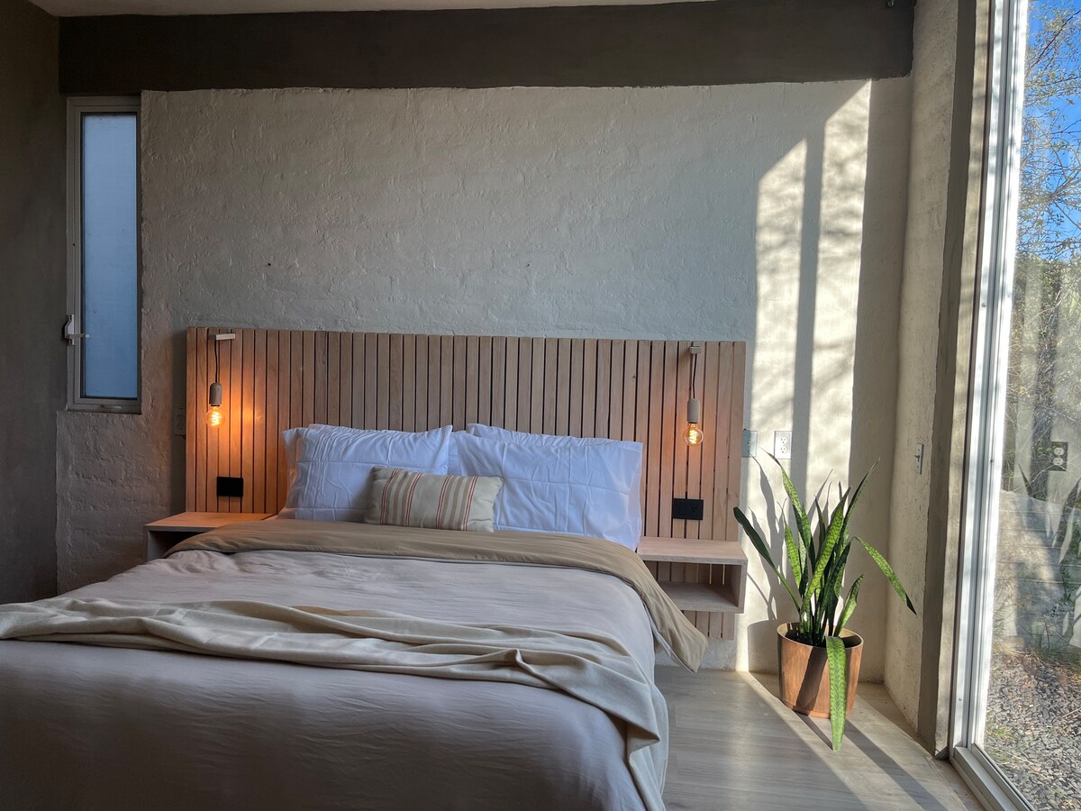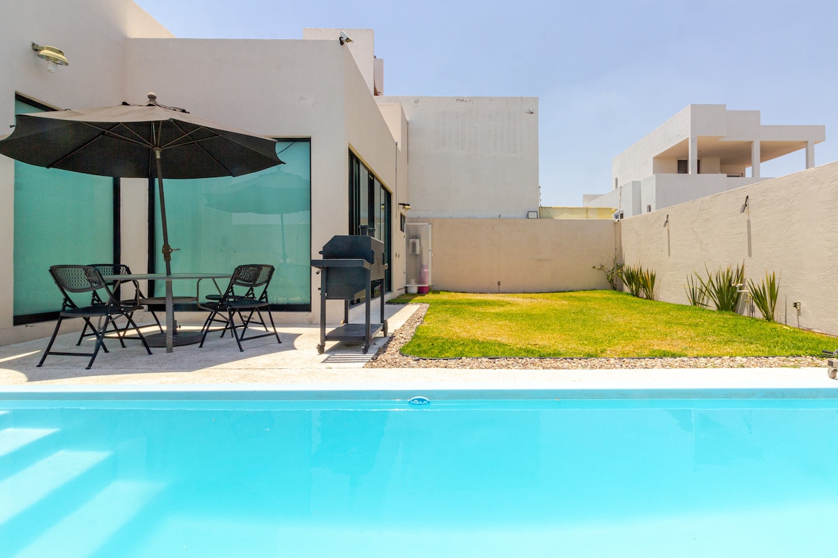Оазис дизайна и спокойствия Элегантный одноэтажный дом с двуспальной кроватью размера Queen size, полной и гостевой ванной комнатой, гостиной с диваном-кроватью и оборудованной кухней. Наслаждайтесь большой террасой с зеркалом и пианино. Перед парком с детскими играми, просторными садами и беговой дорожкой, в частном подразделении с круглосуточной охраной и частной парковкой на 2 машины. Каждая деталь предназначена для вашего комфорта и благополучия, чтобы вы могли насладиться уникальным, расслабляющим и гостеприимным отдыхом.