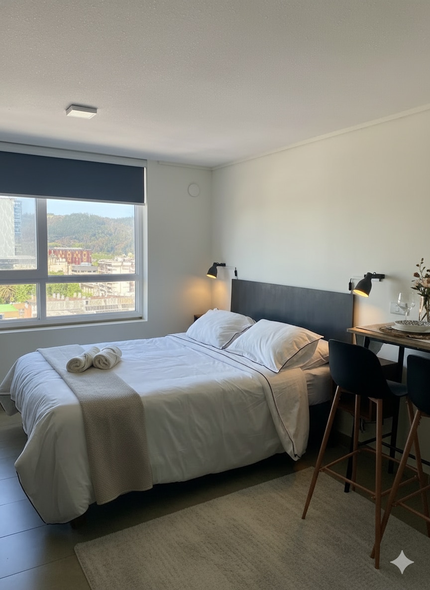 Наслаждайтесь этой современной студией в Прието-Норте 421, в нескольких шагах от проспекта Авенида Германии. Декорадо в нежных розовых тонах и все необходимое: двуспальная кровать, оборудованная кухня, столовая, Wi-Fi и телевизор Smart TV. Окна заполняют светлое пространство и предлагают вид на город. В нескольких шагах от ресторанов, кафе и супермаркетов, торгового центра, университетов, больницы, сервисного центра и баров. Идеально для деловых поездок или поездок. Удобное, безопасное жилье с уникальным расположением.
