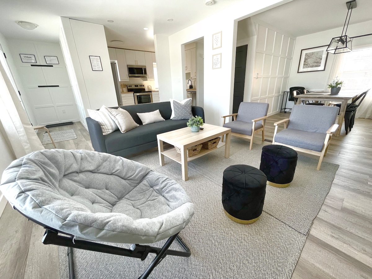 Новый цокольный этаж. Уютное, спокойное место, где вы почувствуете себя как дома, не выходя из дома. К услугам гостей гостиная, где можно расслабиться и посмотреть программы на выбор, кухня, где можно готовить быстрые блюда, удобная спальня с двуспальной кроватью размера Queen size и полноразмерная ванная комната. Складное рабочее место на случай, если вам нужно поработать на ноутбуке. У вас также есть хороший задний двор, где вы можете расслабиться, как дома.