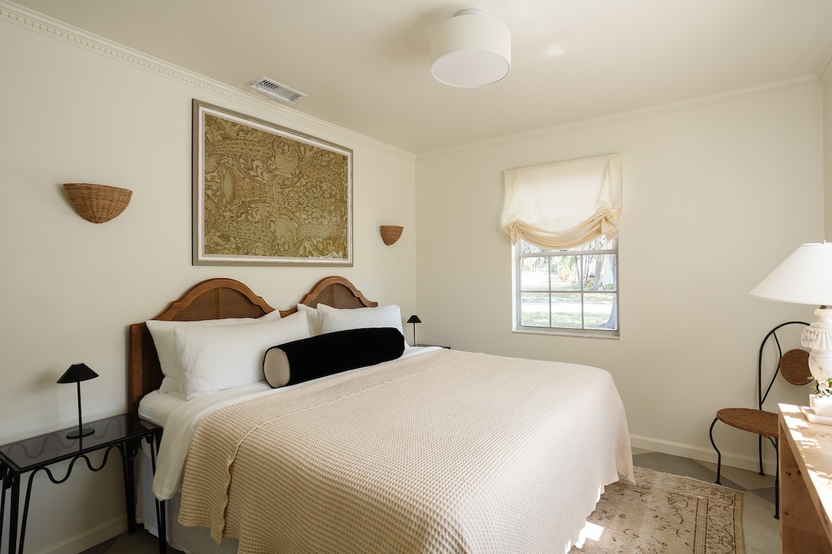 Добро пожаловать в нашу недавно отремонтированную квартиру с двуспальной кроватью размера King size и полностью оборудованной кухней. Парковка на подъездной дороге и самостоятельное прибытие делают это пребывание безопасным и удобным, независимо от того, путешествуете ли вы в одиночку или как пара. Расположен на тихой улице, но недалеко от главной дороги и доступа к Legacy Trail + Pompano pickle ball courts в конце нашей улицы. 5 минут до Pinecraft, местного мороженого, ресторанов и примерно 7 миль до Siesta Key и Lido Key Beach и 15 минут до аэропорта Сарасота.