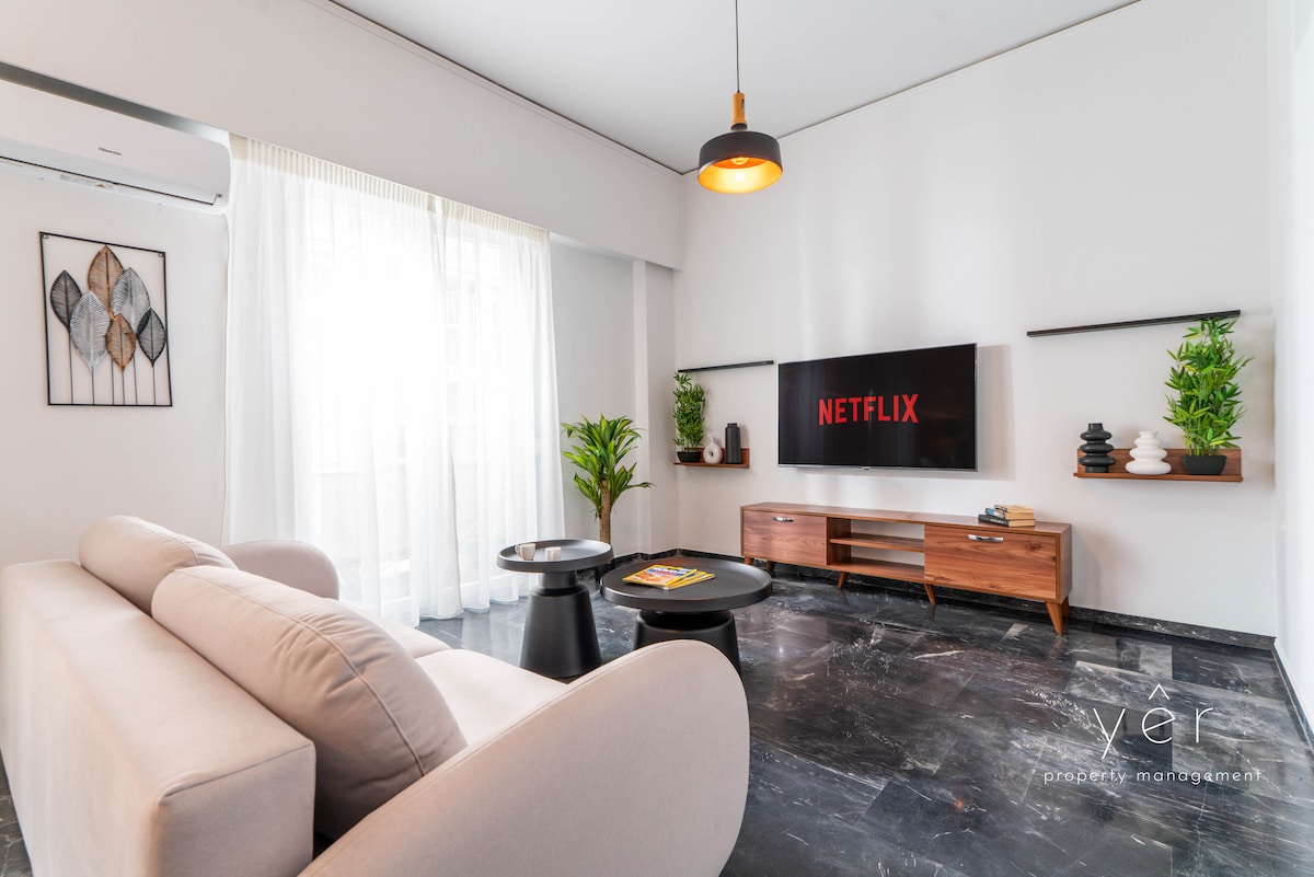 Добро пожаловать в нашу отремонтированную квартиру-студию! В нашей квартире есть множество классных удобств, таких как высокоскоростной оптоволоконный Интернет 200 Мбит/с, умные устройства, игровые приставки, помощник Google Voice, 55-дюймовый телевизор Samsung 4K и аудиосистема с проигрывателем. Она расположена очень близко (5 минут ходьбы) от пляжа Фреатида и ресторанов и кафе Marina Zea, а также в нескольких минутах ходьбы от торгового центра Pireas и станции метро.