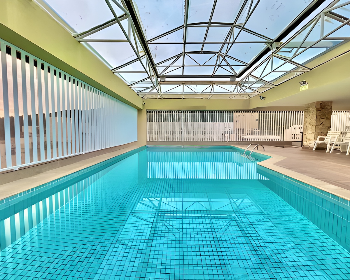 Квартира площадью 65 кв. м с видом на море, 1 спальня с кроватью размера Queen size и кондиционером, ванная комната, большая гостиная с диваном и потолочным вентилятором, телевизор в гостиной, мини-кухня, холодильник, плита, духовка, полный набор посуды для кухни, прачечная. Есть дополнительный матрас. Пляжный сервис, крытый бассейн, сауна, игровая комната, бесплатный Wi-Fi, фитнес-центр, крытый гараж, 50 метров от лучшей части пляжа Питангейрас, рядом с Морро-ду-Малуф. Рядом с магазином LaPlage и ресторанами.