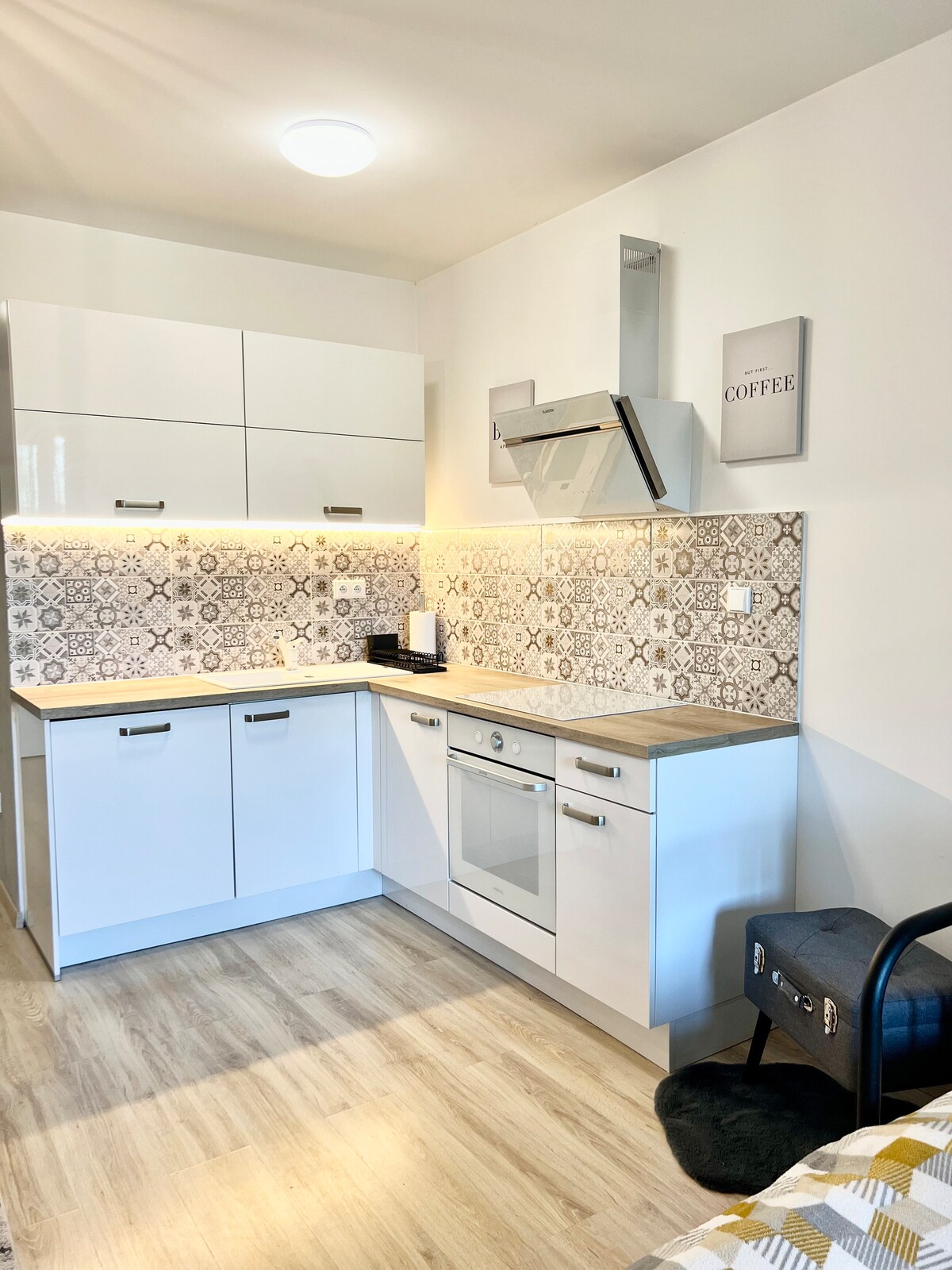 Расслабьте ноги и отдохните в этом тихом, стильном пространстве. Полностью меблированная квартира предлагает вам все необходимое. На полностью оборудованной кухне вы можете с комфортом приготовить утренний кофе или любимый завтрак, которым можно насладиться на просторной террасе с прекрасным видом. Вы можете отдохнуть после работы или долгой поездки, посмотрев любимые сериалы в уютной гостиной. Само собой разумеется, что у вас будет частная бесплатная парковка в специально отведенном месте прямо перед многоквартирным домом.