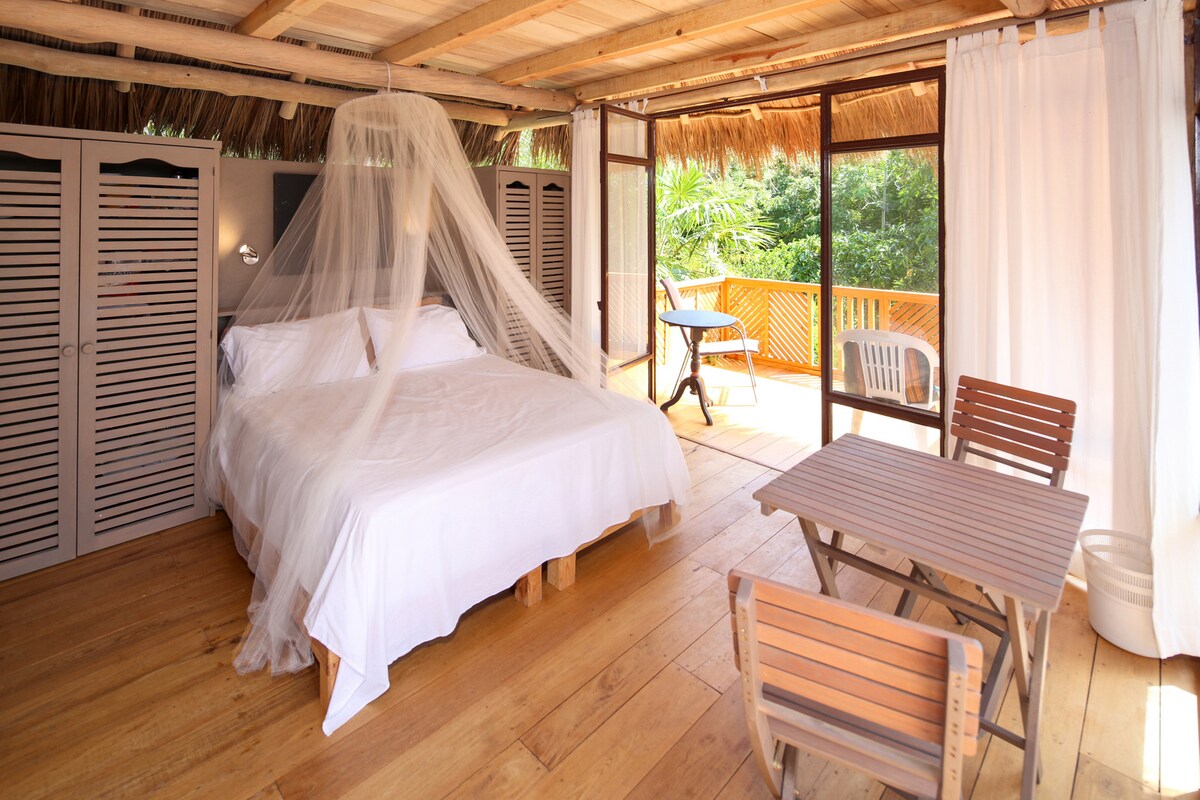 ДЕРЕВЕНСКИЙ ЛОФТ ПОД ОТКРЫТЫМ НЕБОМ; непревзойденный вид; без кондиционера или экранов; тропические джунгли. 2 минуты пешком до широкого спокойного пляжа. Пляжные стулья/зонтик, Wi-Fi, горничная, сейф, общий бассейн с джакузи, камеры видеонаблюдения, LR, бар, мини-кухня, ванна/душ, 2-й верхний лофт, домашние кошки. Спальня с кроватью размера Queen size. Москитная сетка, вентиляторы, океанский бриз, спрей от насекомых. 6 минут пешком до пляжа или улицы до ресторанов. Если вы чувствительны к насекомым, обратите внимание на африканский люкс Calabaza с кондиционером, сетками и дверями.