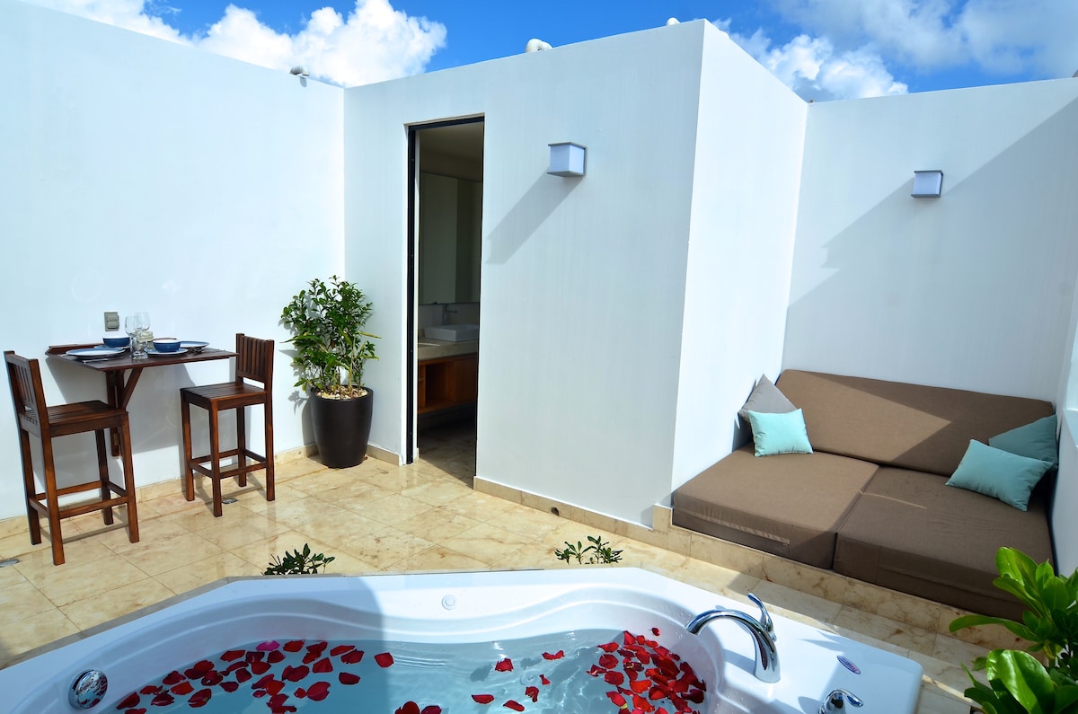 В нескольких шагах от моря и знаменитой 5-й авеню, в безопасном районе, эта фантастическая квартира идеально подходит для тех, кто любит хороший образ жизни. Собственная терраса с джакузи с видом на тропический сад, бесплатный WI-FI и частная парковка. В Aluxeshome есть большая комната для отдыха с диваном-кроватью, спальня, 2 ванные комнаты и кухня. Лифт и охрана. Рядом с лучшими пляжными клубами, ресторанами, кафе, магазинами, искусством и музыкой местных жителей. До него легко добраться на автобусе, такси или машине ADO.