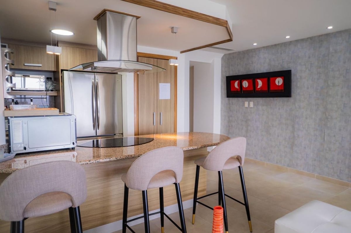 Полностью оборудованная квартира в районе Хуан-Долио, всего в 20 минутах от аэропорта, с видом на пляж, полностью оборудованная кухня, 2 кровати размера King size, 2 полноразмерные кровати, матрасы для ухода за спиной, центральный кондиционер, 2 телевизора 65 и 55дюймов, потоковая передача, Netflix, Wi-Fi, стиральная машина, сушилка, ставни, сетка безопасности на балконе, 2 лифта, тренажерный зал, бассейн для взрослых, 2 джакузи, детский бассейн, барбекю, бильярд, домино, настольный футбол, детская игровая площадка, терраса, парковка и потрясающие развлечения.