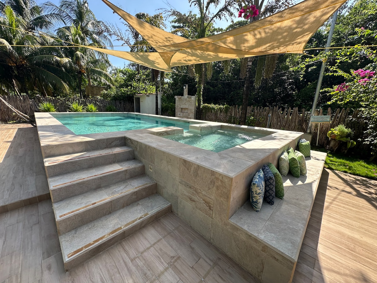 Общайтесь с природой в этом незабываемом отпуске, маленький домик с двумя спальнями, двумя ванными комнатами и перед внушительным бразильским бамбуком, то же самое придает тень и к бассейну, что позволяет быть в прохладной и приятной атмосфере. В четвертом ряду, в пяти минутах ходьбы от пляжа или в 3 минутах езды на машине. Если вам нужен дом на берегу океана, наш дом не для вас.