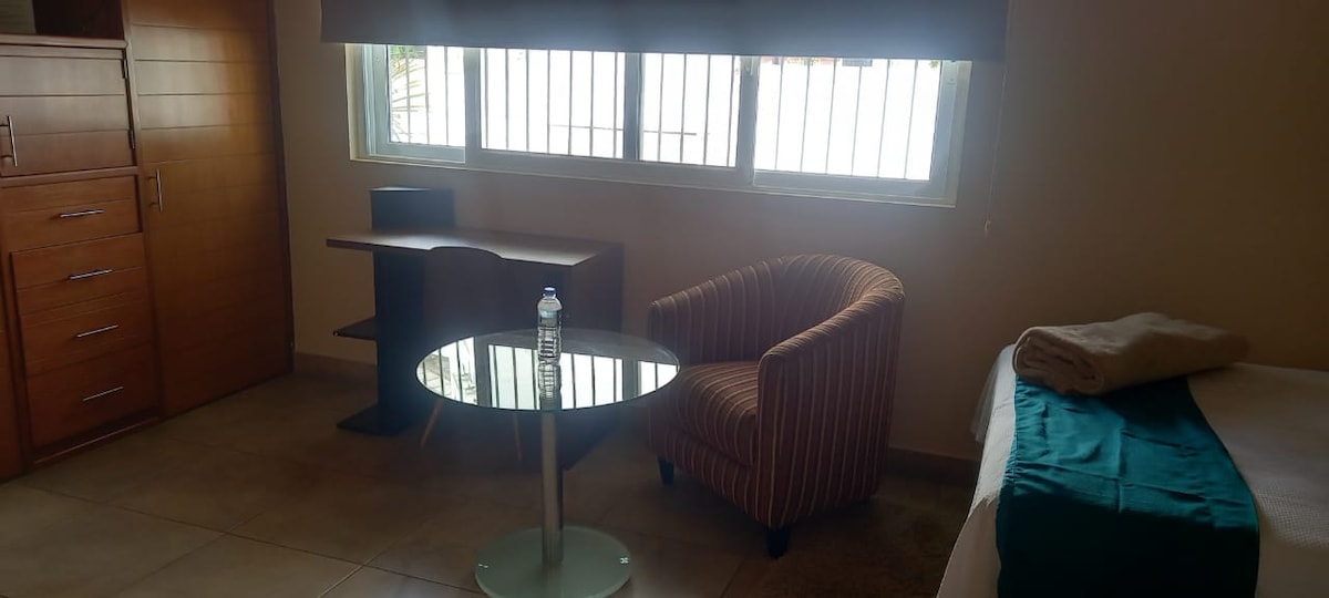 Отдельная комната с ключом от входа (хотя у нее общий вход в здание), она хорошо освещена, оснащена кондиционером, микроволновой печью, холодильником, обеденным столом, ящиком, собственной ванной комнатой, Wi-Fi, потолочным вентилятором и телевизором. К услугам гостей стиральная машина и сушилка в общей зоне, которыми пользуются другие гости.