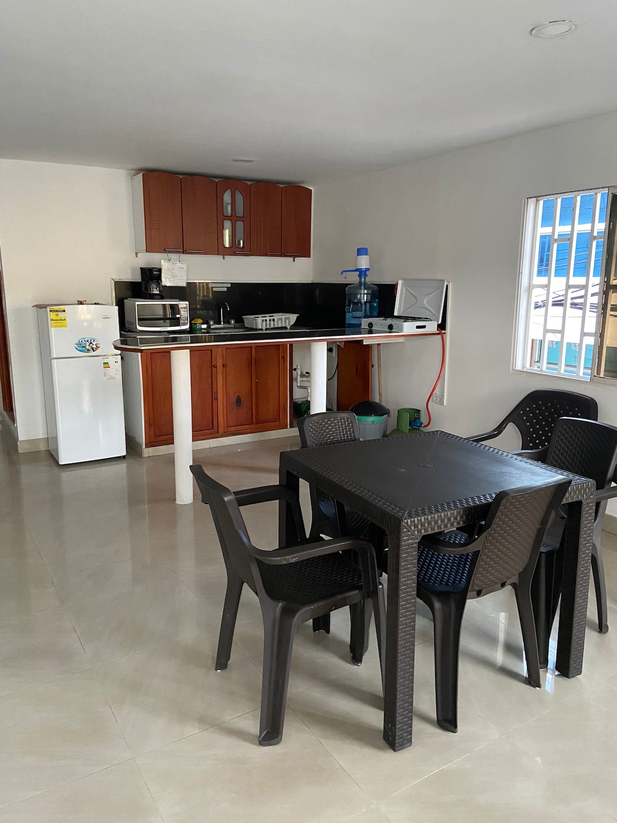 Los Apartaestudios, с отдельным входом комфортабельные номера площадью 28 метров с собственной ванной комнатой, балконом или террасой , кухней. Можно разместить до 3 человек, в ней есть 1 двуспальная кровать и односпальная кровать Nest,кондиционер, цифровой телевизор, шкаф, сейф, мини-кухня с холодильником, микроволновой печью, вафлерой, кофеваркой, блендером, есть 1 плита , кухонная утварь, услуга Wiffi, барбекю и парковка. Мы находимся рядом с аэропортом в заливе САРИЕ в 6 кварталах от главного пляжа.
