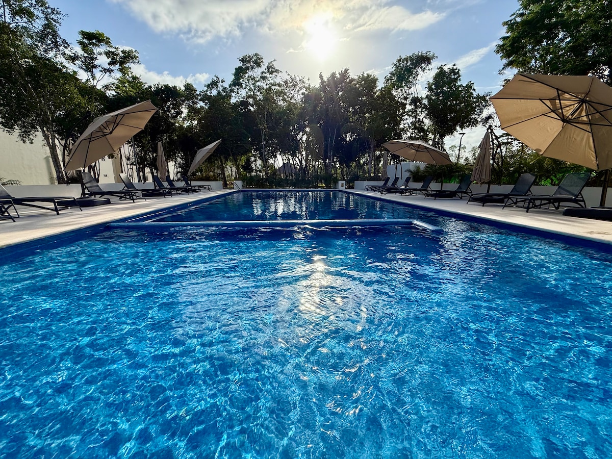 🪻A solo unos pasos de una de las playas más exuberantes y de la 5ta Avenida, este moderno departamento te brinda una experiencia sin precedentes. Reposa en una cómoda cama king, disfruta de tus pelis favoritas en Smart TV y explora tu creatividad en una cocina práctica y funcional. 🌿Disfruta de tu espacio al aire libre en un balcón privado. Y si buscas algo más especial, sube al rooftop: ahí te esperan una infinity pool, la vista parcial al mar y el radiante sol del Caribe.