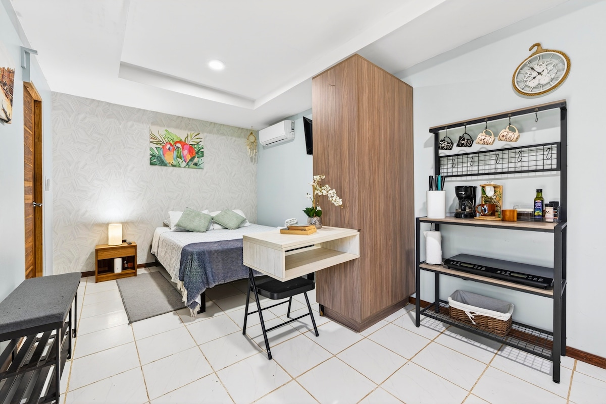 Bienvenido! Добро пожаловать в комплекс Casa Aire. Casa Aire Complex - это экологичный комплекс с пятью уникальными домами. В квартире есть - 1 спальня, 1 ванная комната и диван-кровать в гостиной, вмещает 3 человека . Все домашние стили изолированы от энергоэффектельности и полностью меблированы. Гуанакасте и другие местные леса использованы в дизайне интерьера. На территории есть охрана и сотрудники службы безопасности. Общая зона общего пользования является общей парковкой среди других квартир.