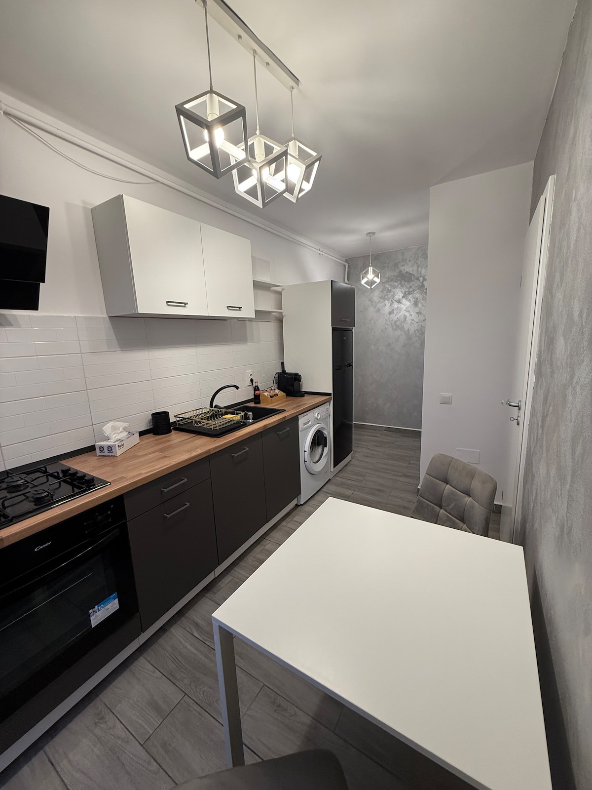 Уютное место Питешти. Идеально подходит для пар, одиночных и командировочных. Абсолютно новое оформленное место с новой мебелью и техникой, расположенное в центре Питешти, недалеко от множества ресторанов, кофеен, супермаркетов. В студии на первом этаже есть спальная зона с раздвижным диваном на 2 человека. В студии есть полностью оборудованная кухня, холодильник, газовая варочная поверхность, электрическая духовка, стиральная машина, кабельное телевидение, бесплатный Wi-Fi, бесплатный Wi-Fi,бесплатная общественная парковка в задней части здания.
