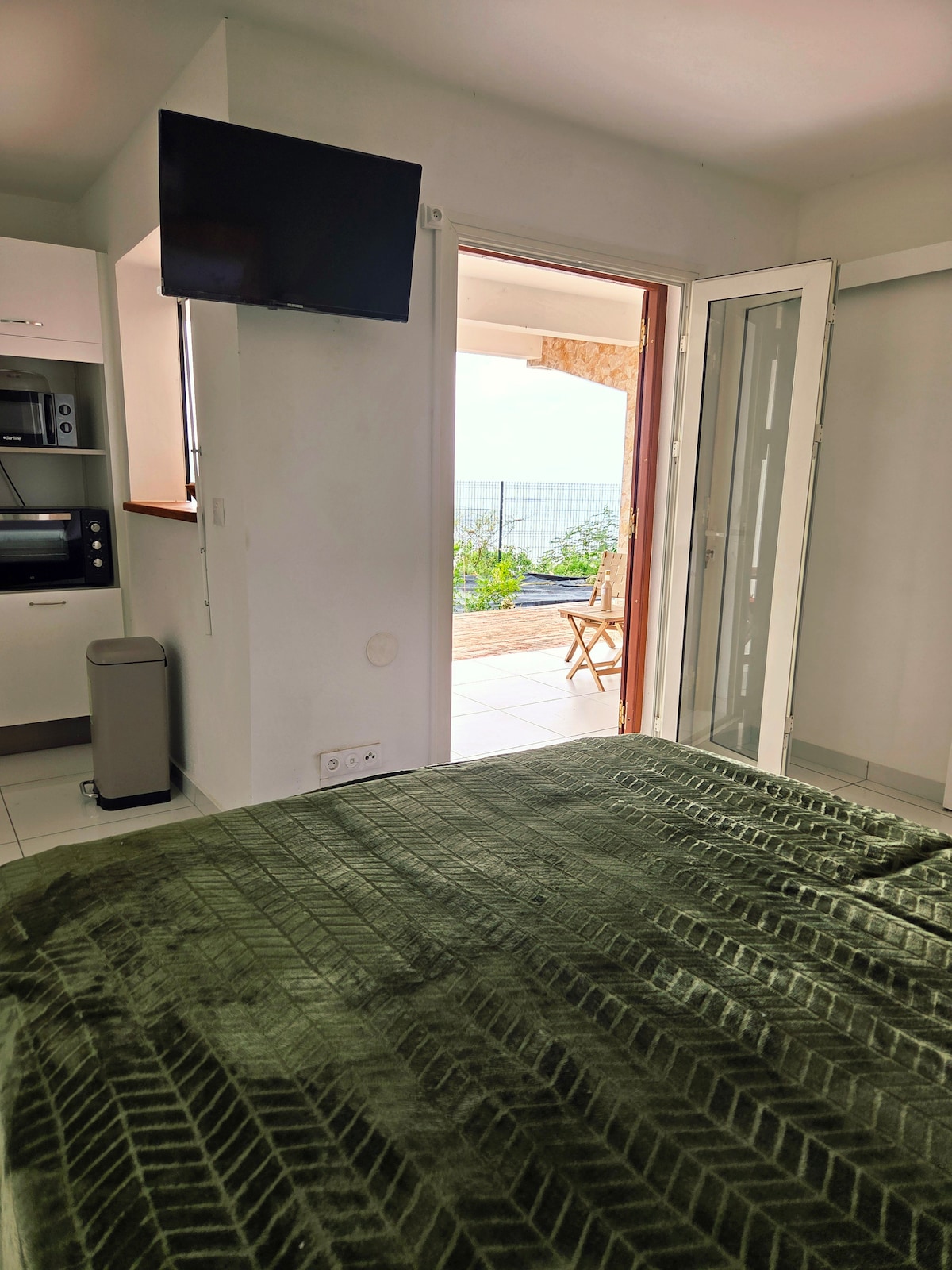 Тихая студия на высотах Бульянте с великолепным видом на Карибское море Идеально подходит для пар. Студия выходит на большую террасу. У вас есть полностью оборудованная кухня (холодильник, микроволновая печь, индукционная плита, кофеварка). Комната с противомоскитной сеткой. Размер кровати 140*190. Предоставление бытового белья (простыни, полотенца и чайные полотенца) Ванная комната с душем. Доступ к Wi-Fi