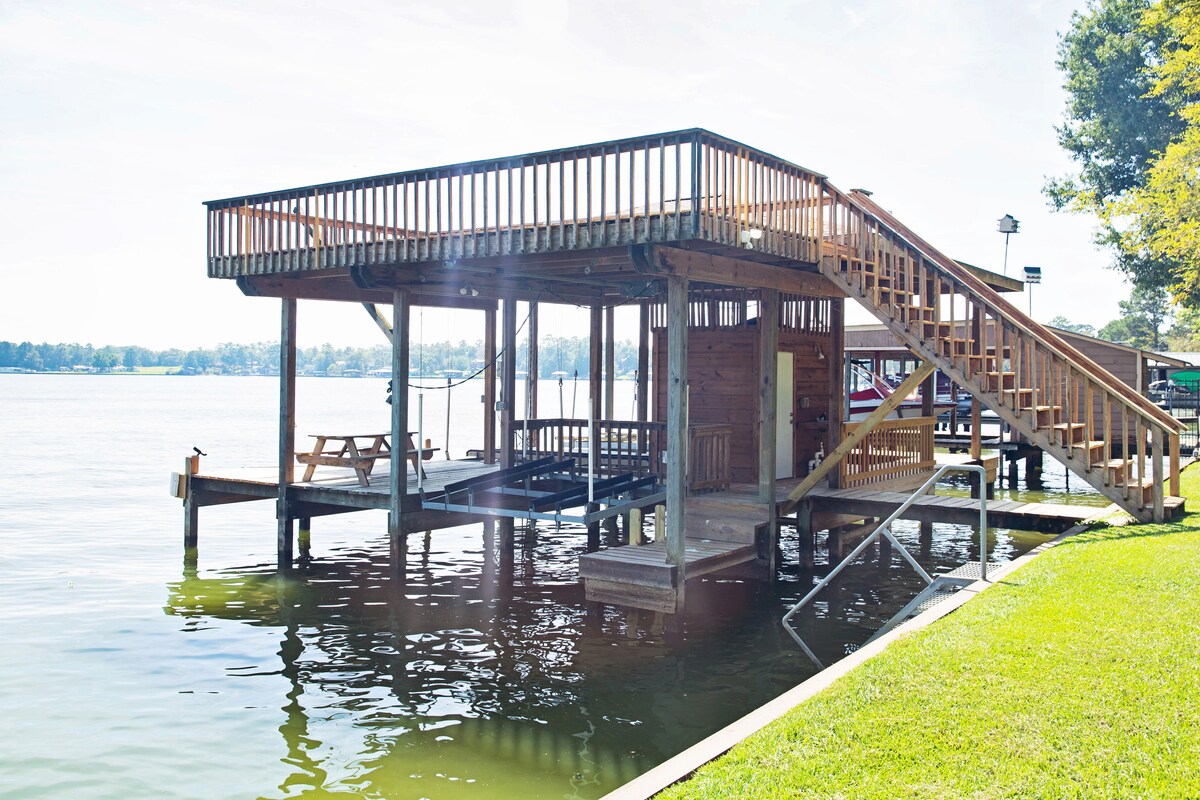 Уютный бревенчатый домик на берегу озера с лодочным причалом