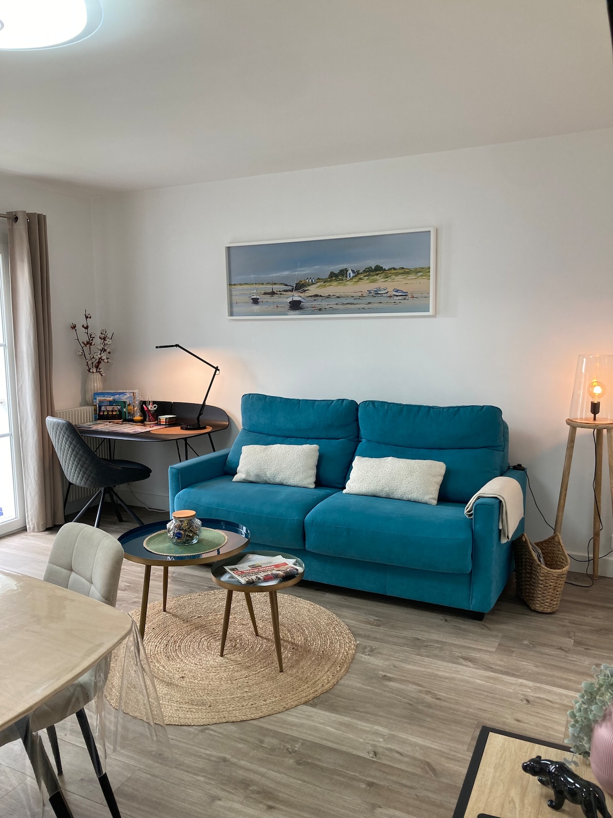 В самом сердце прохода, популярный район Конкарно на южной стороне входа в порт. Расположена на 1 этаже небольшой охраняемой резиденции, недалеко от магазинов ( пекарня, супермаркет, торговца рыбой, аптека...) 3-звездочная квартира состоит из большого жилого пространства площадью более 27 кв. м с видом на юг с оборудованной кухней. Гостиная с диваном-кроватью (новое постельное белье 160), телевизором, Интернетом и оптоволоконным столом. 2 безопасных парковочных места. Тихий, идеальный для удаленной работы.