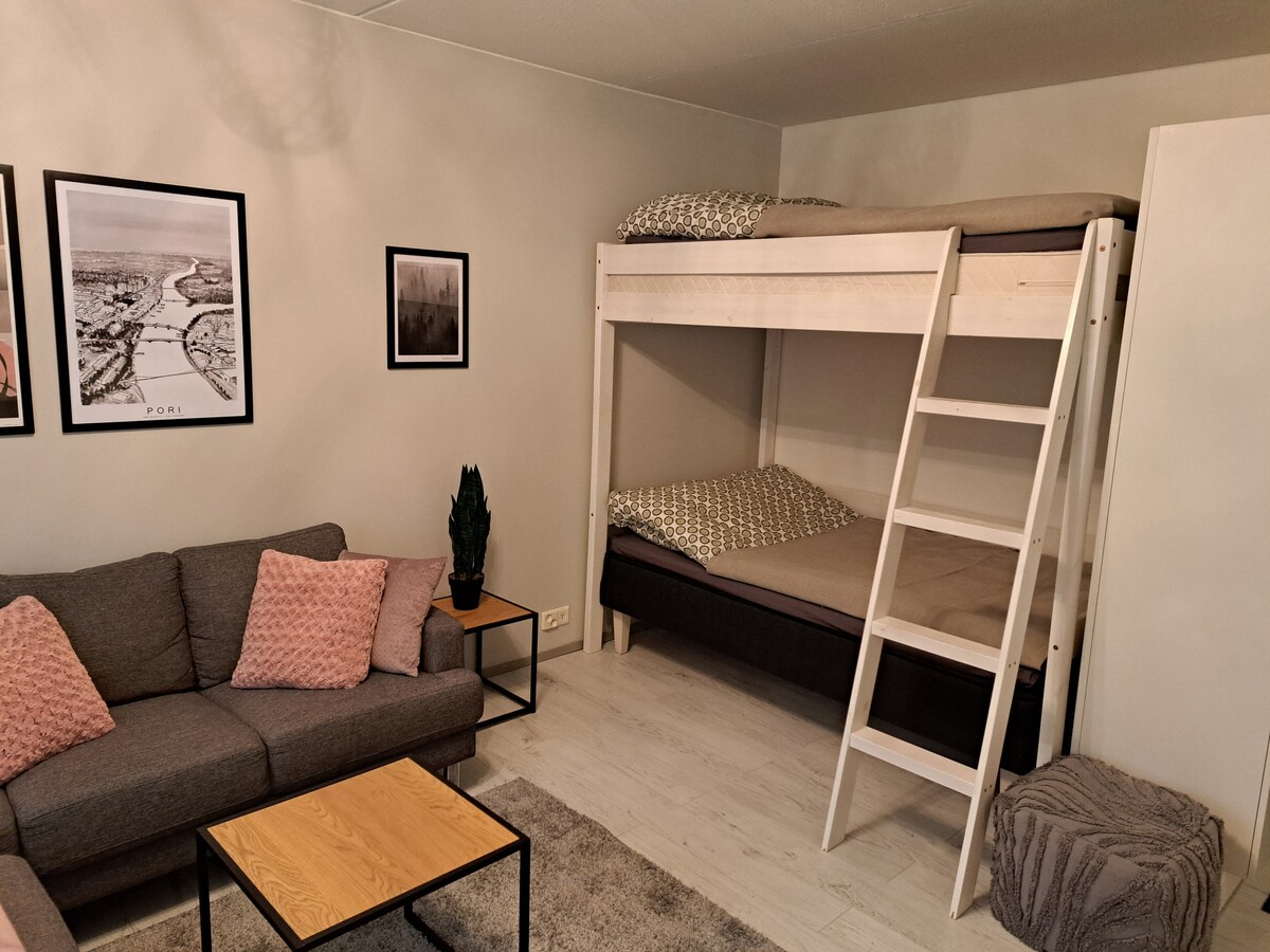 Квартира находится примерно в 15 минутах ходьбы от центра города. 5 минут пешком до Satasairaal, SAMK, автобусного и железнодорожного вокзала и 10 минут до аэропорта. Рядом курсирует городской автобус, так как по городу можно передвигаться по городу. Студия - это конечная квартира в оштукатурном таунхаусе с отремонтированной ванной комнатой и мини-кухней. Рядом беговые площадки. Перед домом есть бесплатная парковка с вилкой для обогрева автомобиля или гибридной зарядки. Двуспальная кровать, 140 см, плюс диван-кровать, который можно разложить. Wi-Fi.