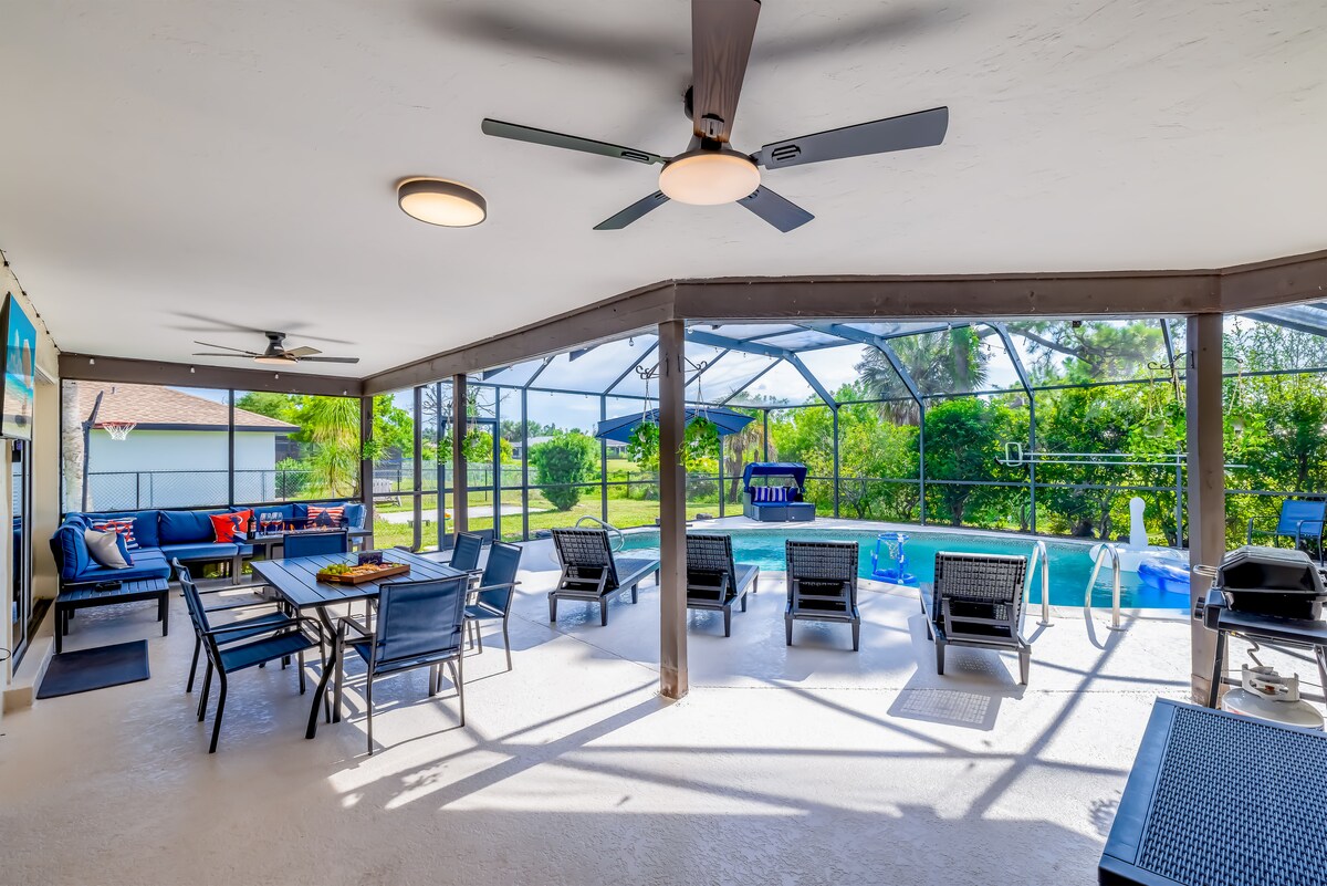 Мы хотим быть вашими хозяевами в Порт-Шарлотте! — Отличное расположение: недалеко от красивых пляжей Гаспарилья, Сиеста-Ки, Энглвуд. — 5 просторных спален (рассчитаны на 14 гостей). - Яма для костра. - Гидромассажная ванна. — Тренажерный зал. - Бильярдный стол. - Покерный стол. - Хокейный стол — барбекю и уличная мебель; - Полностью оборудованная кухня с современной техникой. - Быстрый Wi-Fi — 3 телевизора Smart TV с приложениями для потокового видео. — Самостоятельное прибытие и круглосуточная поддержка хозяев. - Стиральная и сушильная машины. - Бесплатная парковка.