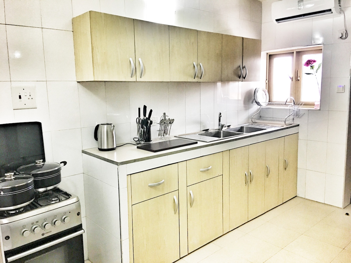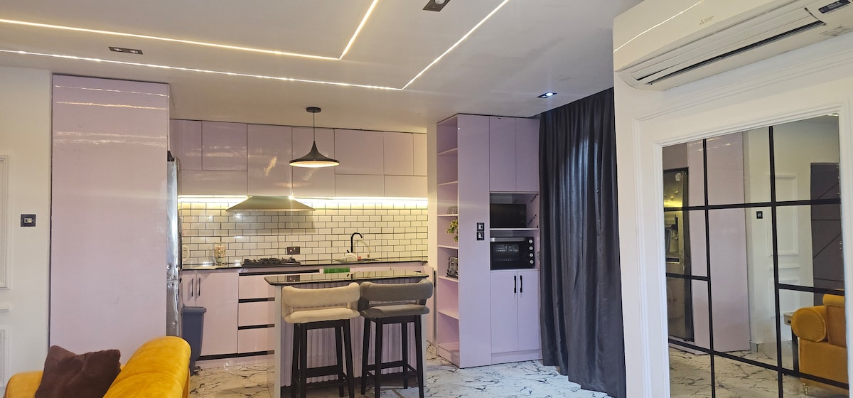 2 spacious bedrooms with premium bedding 2.5 bathrooms PS5 + Smart TV Fully equipped kitchen Private balcony High-speed WiFi Dedicated workspace with a 32” curved Dell monitor 24/7 power, water & security Treadmill and Arbs Stretcher available for workouts Very Secured Estate, CCTV & SELF Check-in