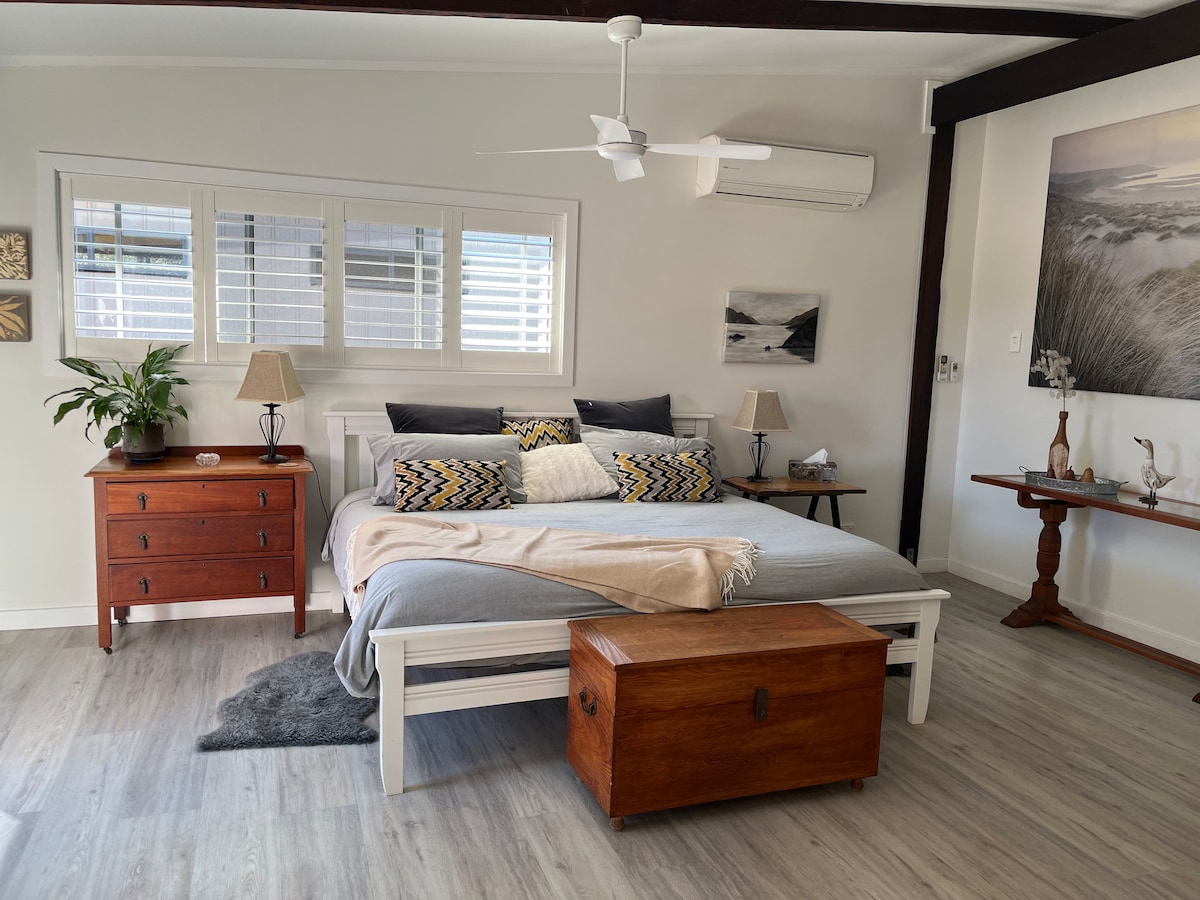 Расслабьтесь в уютной комфортабельной квартире, частном патио/дворе и спокойный вид на тропический сад... затем в нескольких минутах ходьбы до нашего семейного пляжа Шелли-Бич через продуктовый магазин/магазин на вынос и прогулка по тропическому лесу Без завтрака, но кофемашина Nespresso и молоко и чай предоставляются. Полностью оборудованная кухня/некоторые предметы для кладовой Подходит для пар с одним ребенком и ребенком или еще одним дополнительным взрослым в односпальной кровати размера King size в гостиной. Отдельный вход, хозяева наверху. Наслаждайтесь ресторанами и отличными развлечениями.