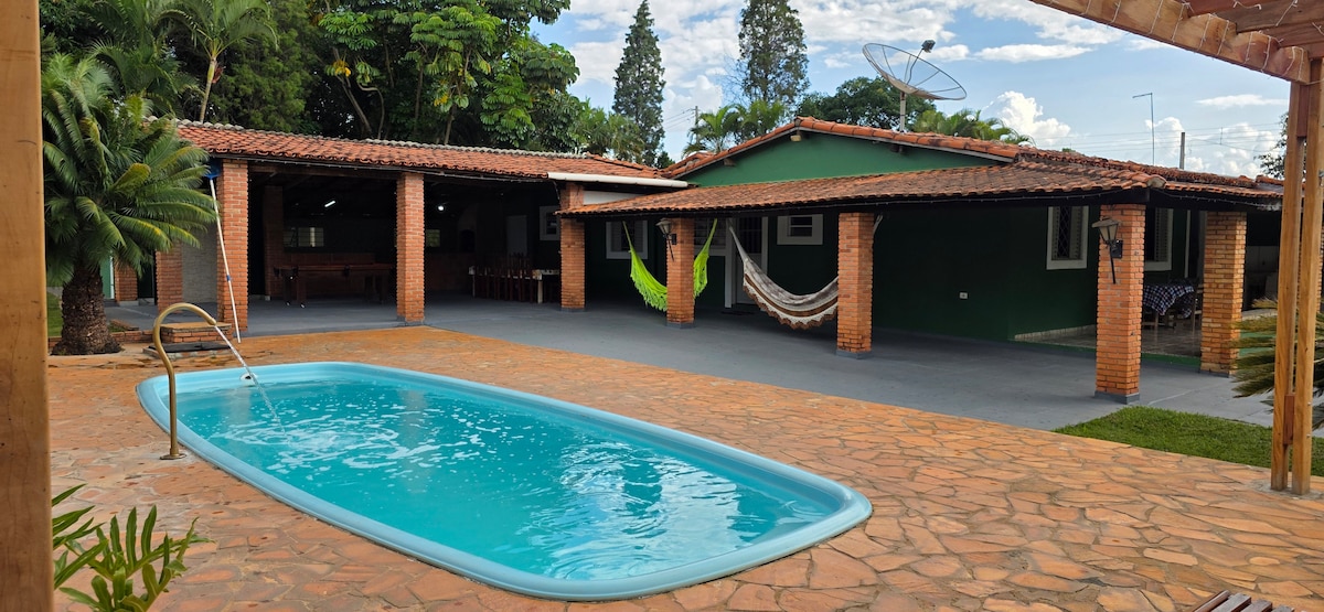 Chacara Cond Fechado, Segurança 24Hs tudo novo, com uma aconchegante casa toda Varandada que possui Por do Sol de cinema, possui 3 quartos com Suites completas. Cozinha equipada, Internet, guarda sol grandes, cadeiras de piscina, estacionamento e muito mais.A churrasqueira possui fogão a lenha, com dois banheiros externos além da piscina 8x4 com cascata decorativa, sol pega o dia todo na piscina. Todas tomadas tem 220V e 110V.